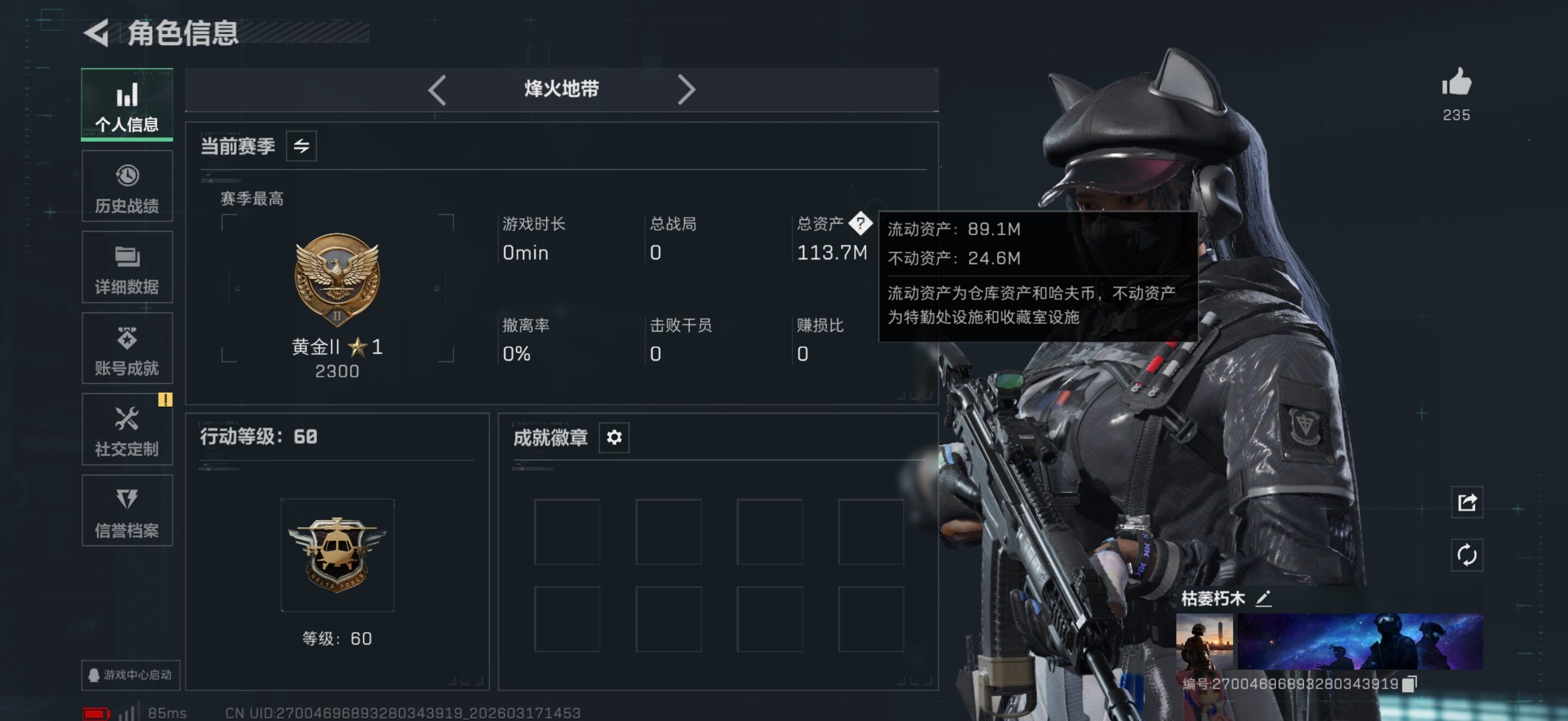 【Q区三端互通】【【可二次】】YXz9247-特勤处:仓库8级/靶场6级/训练中心7级-总资产113m-哈夫币127w-烽火等级:60级