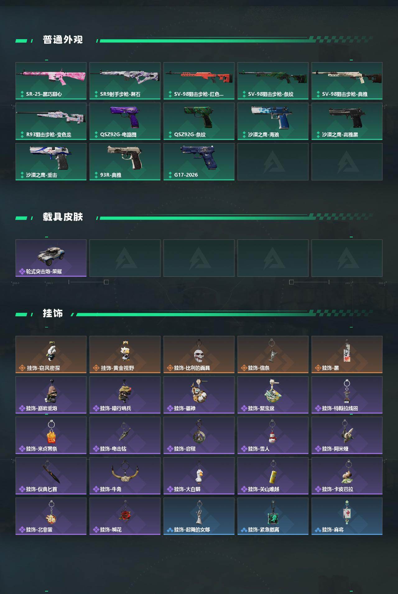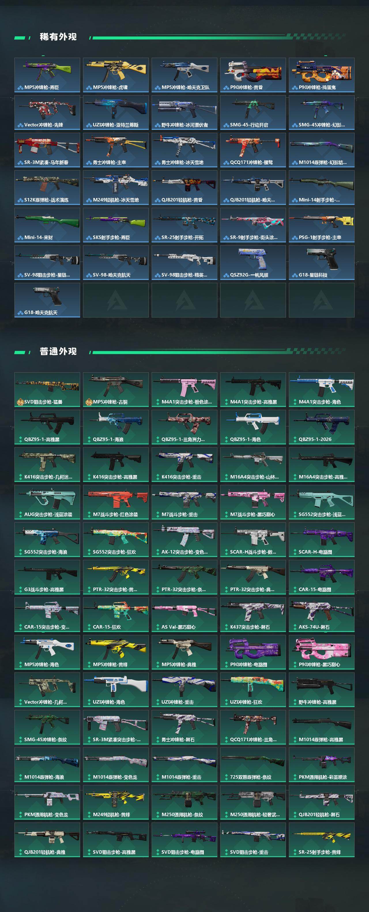【传说外观】:M4A1突击步枪-阿米娅,ASh-12战斗步枪-鹅鸭杀,SG552突击步枪-运动员,AK-12突击步枪-特斯拉线圈,SCAR-H战斗步枪-启航,CAR-15突击步枪-阿米娅,腾龙突击步枪-捞点薯条,K