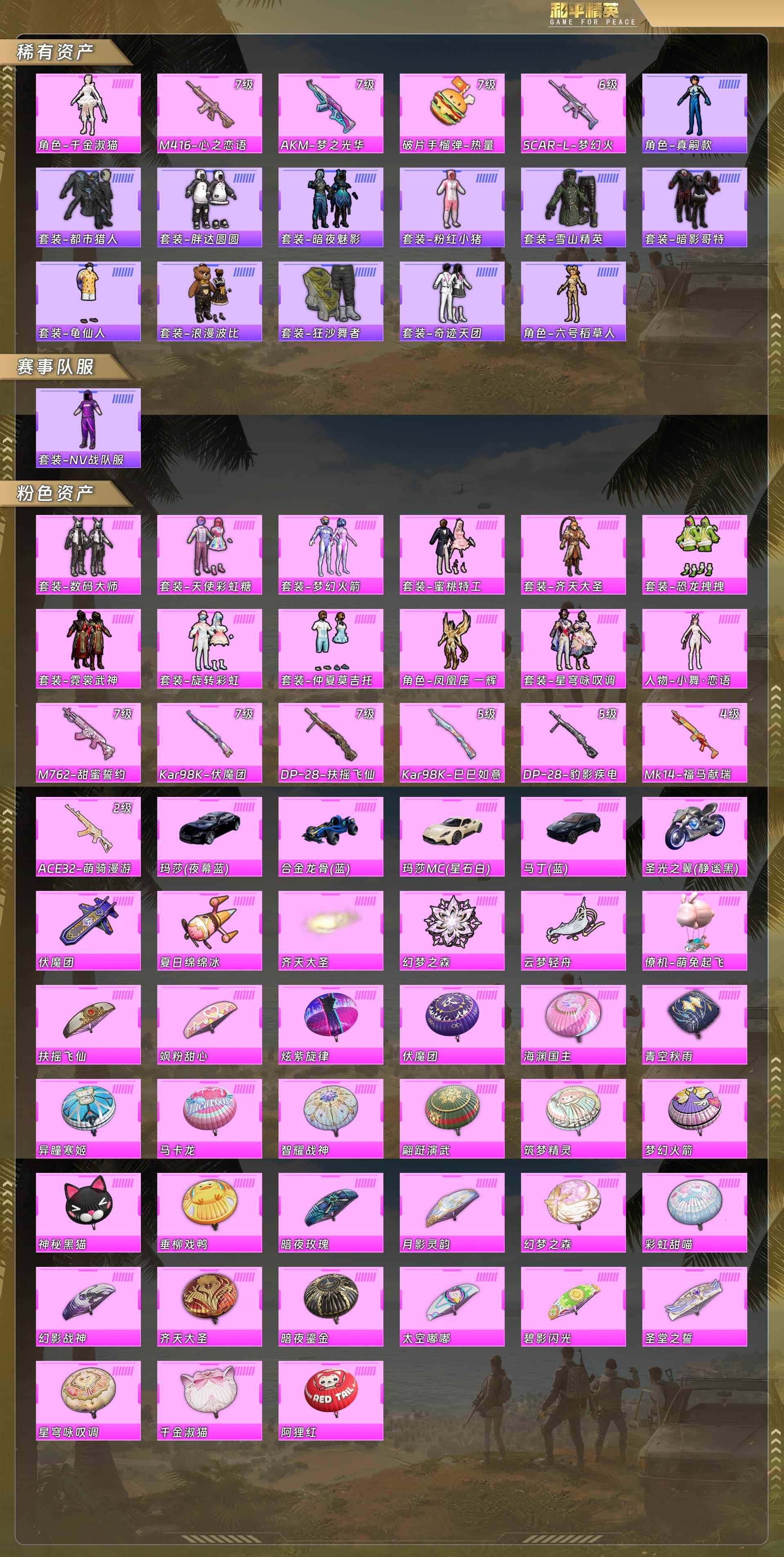 身法号-千金淑猫/M4心之恋语7级/AK梦之光华7级/手雷热量炸弹7级/SCAR梦幻火箭6级/真嗣款战斗服/都市/胖达圆圆/暗夜魅影/粉红小猪/老六服/红眼罩/浪漫波比/狂沙舞者/火箭少女/恐龙拽拽/小舞恋语/M762甜蜜誓约7级/98K伏魔团7级/DP28扶摇飞仙7级/(蓝)/合金龙骨(蓝)/玛莎拉蒂(白)/阿斯顿马丁(蓝)/圣光之翼(黑)(13粉装11粉枪5载具)没战神框HP6610-5粉色飞行器-115947热力值-17王牌印记-229套装-330枪皮