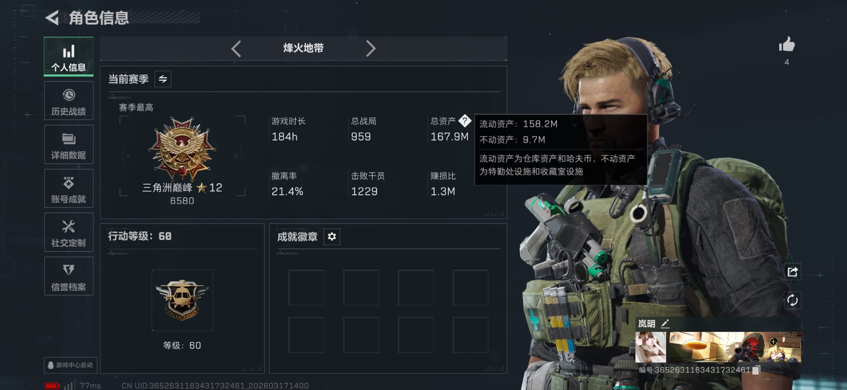 【Q区三端互通】【【无二协助处理】】YXz9405-特勤处:仓库6级/靶场4级/训练中心6级-总资产167m-哈夫币6370w-烽火等级:60级