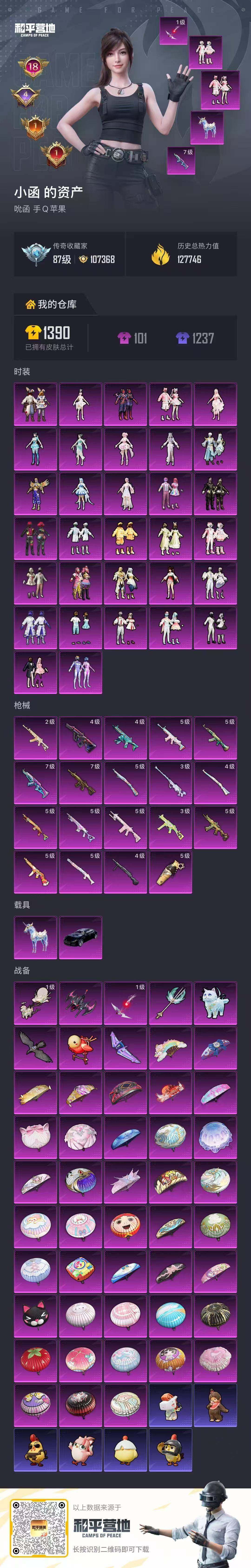 苹果 手Q-32粉装-19特效枪-2载具-8粉色飞行器-127776热力值-18王牌印记-276套装-348枪皮