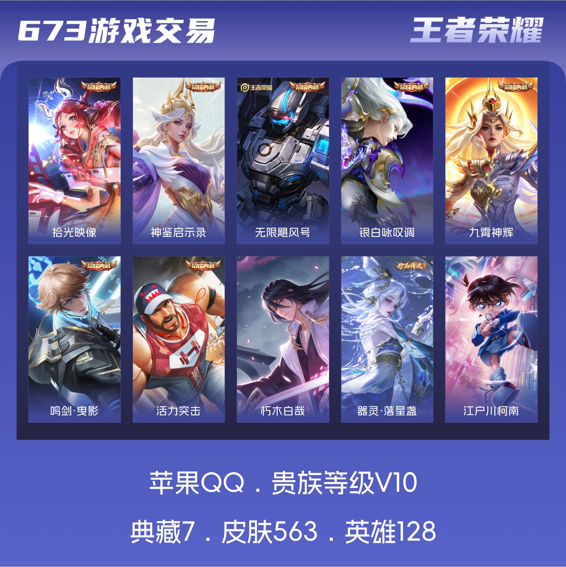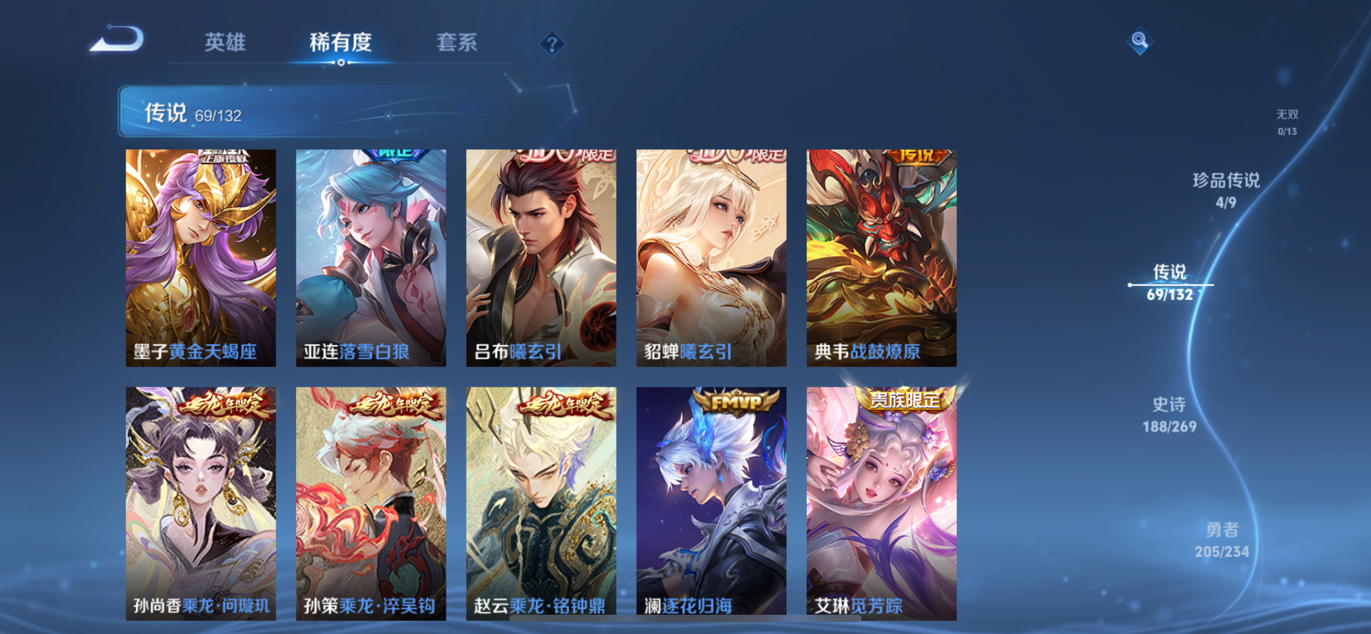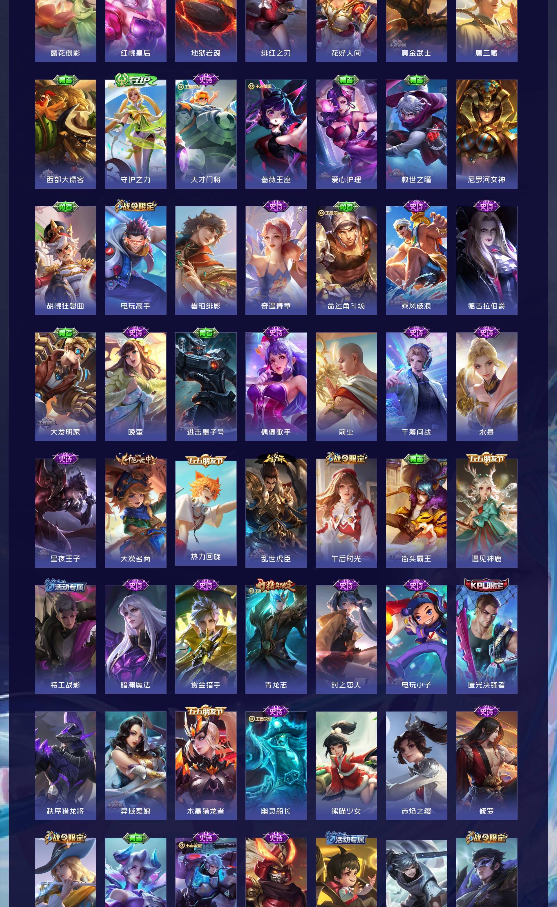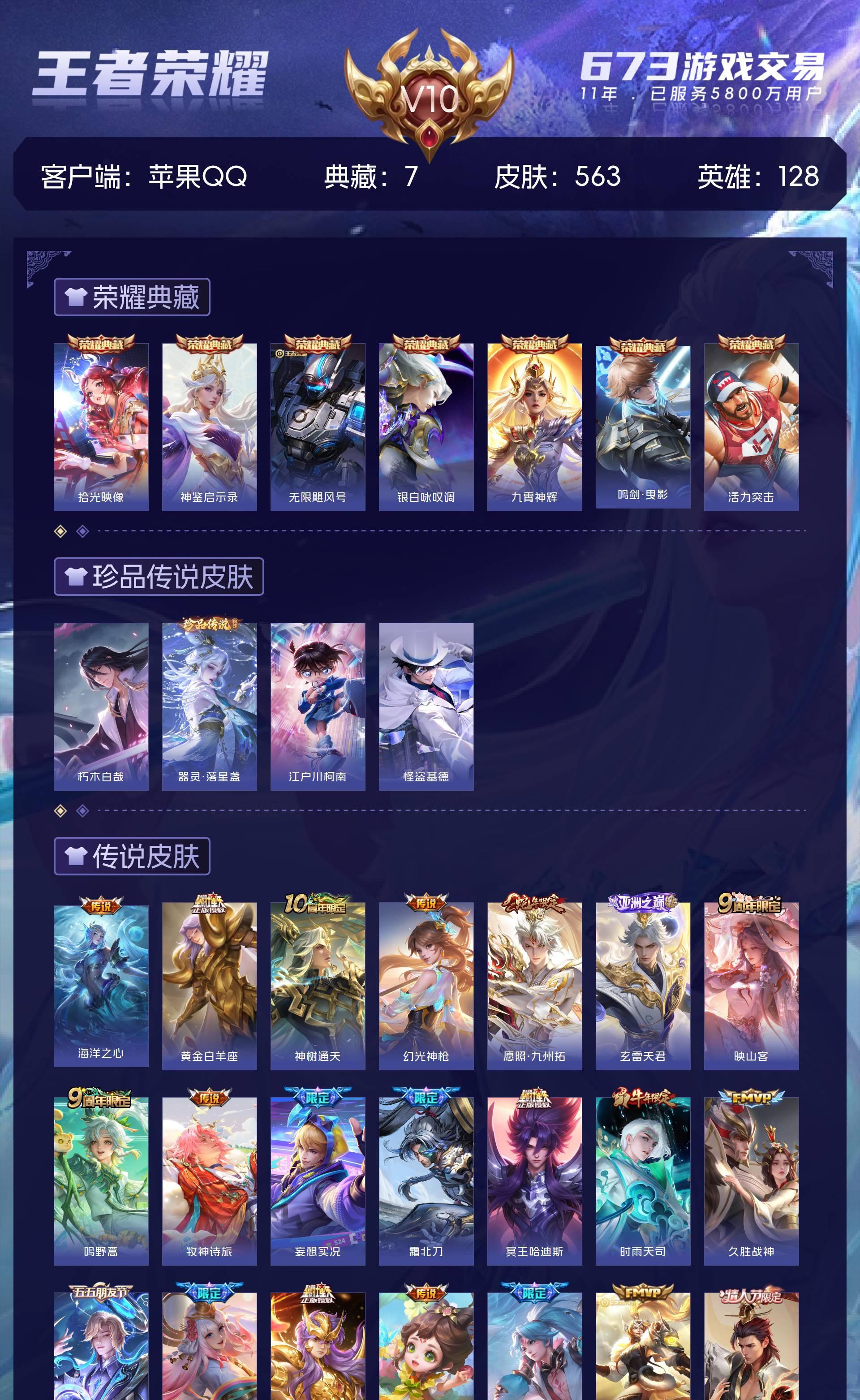 V10 皮肤563 英雄128 荣耀王者 荣耀典藏7 珍品传说4 星传说2 传说70 其他皮肤487