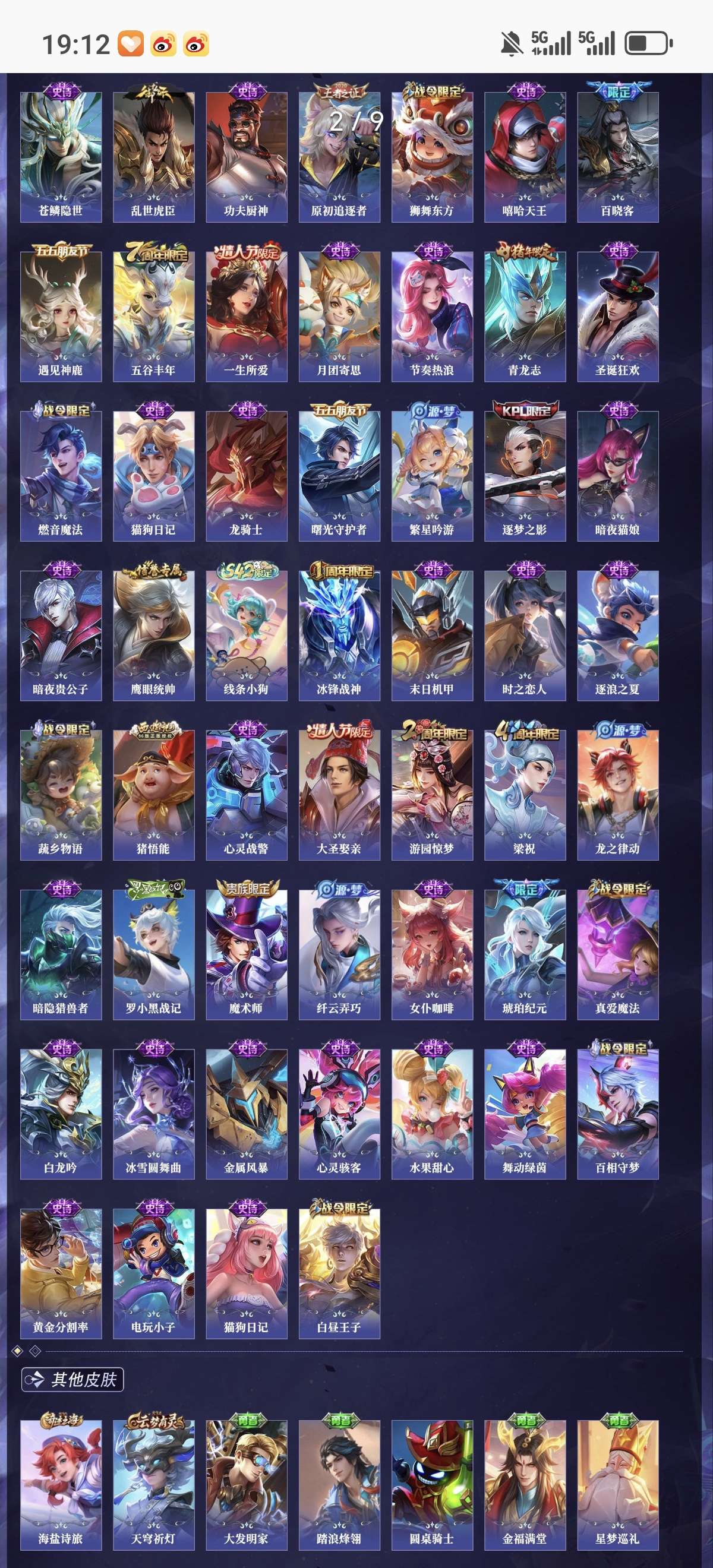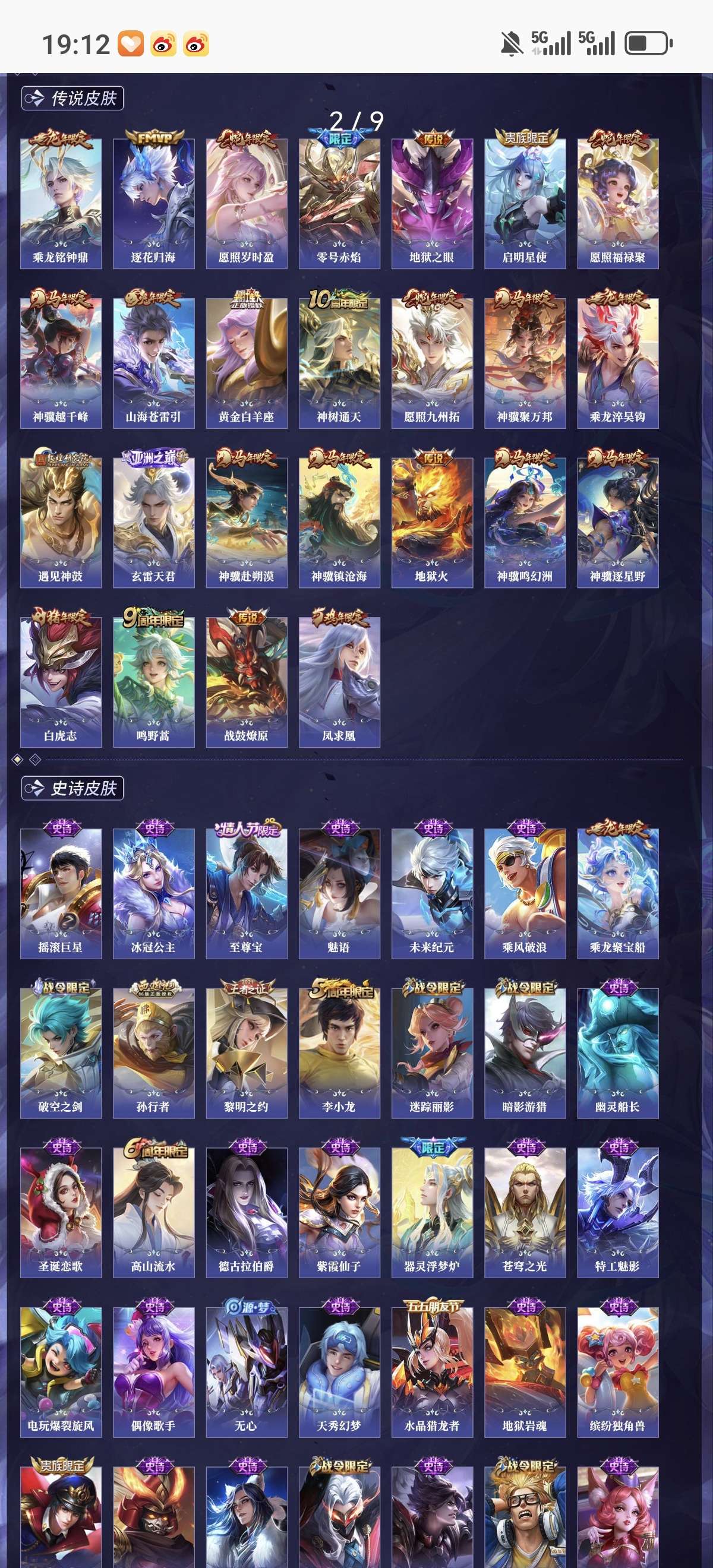 贵族9 荣耀典藏2 无双2 星元皮肤2 传说皮肤25 星元套装21 史诗皮肤88 打野21段 皮肤数