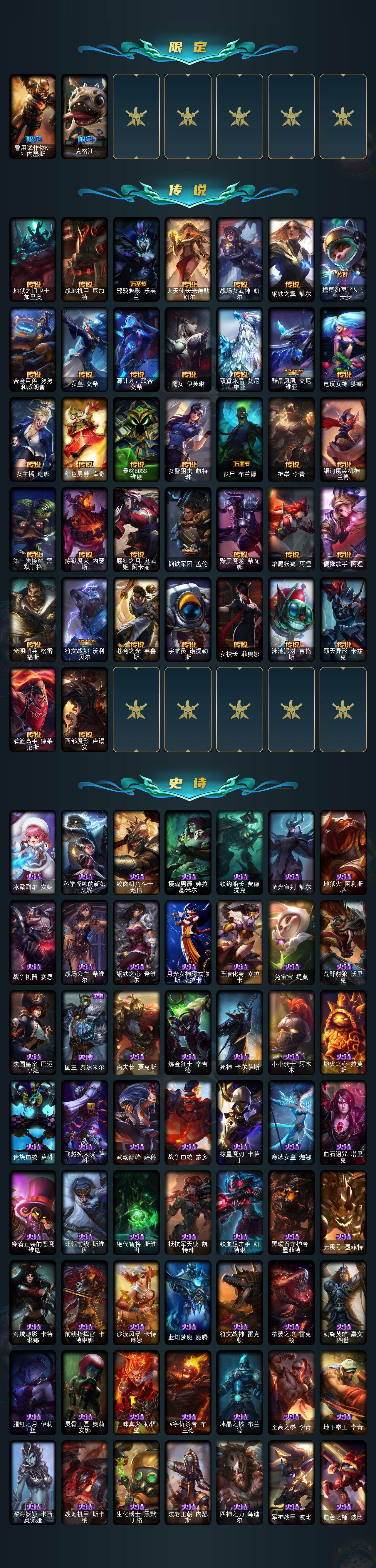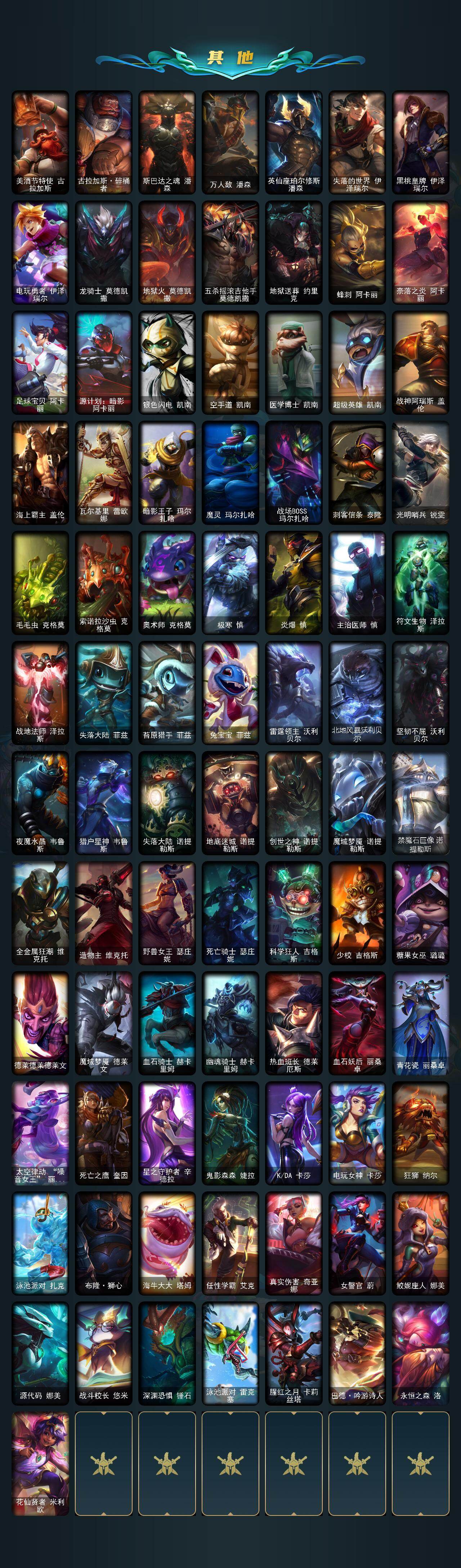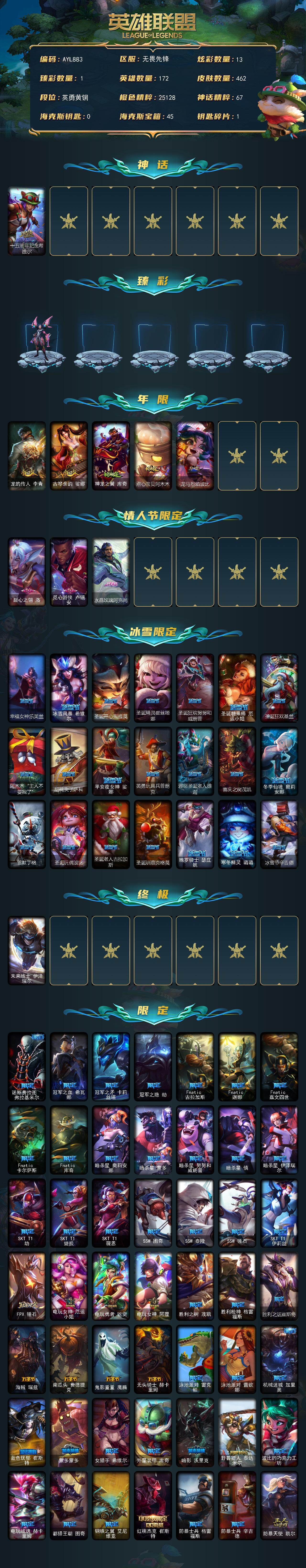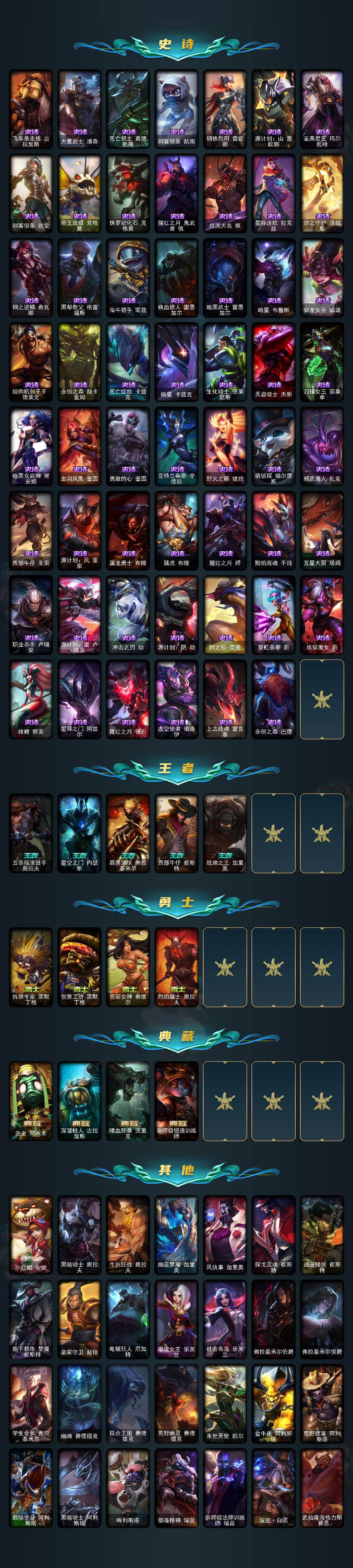 青铜段位-172英雄-462皮肤-13炫彩-1终极-1神话-80限定-37传说