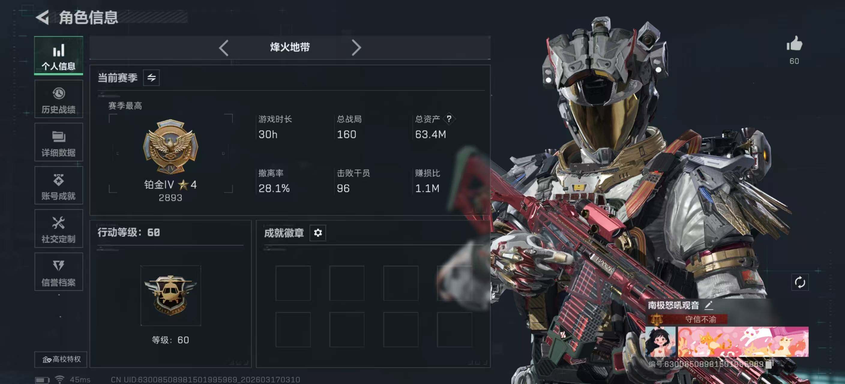63m总资产-988k哈伏币-60烽火等级-铂金-32战场等级-上等兵【干员