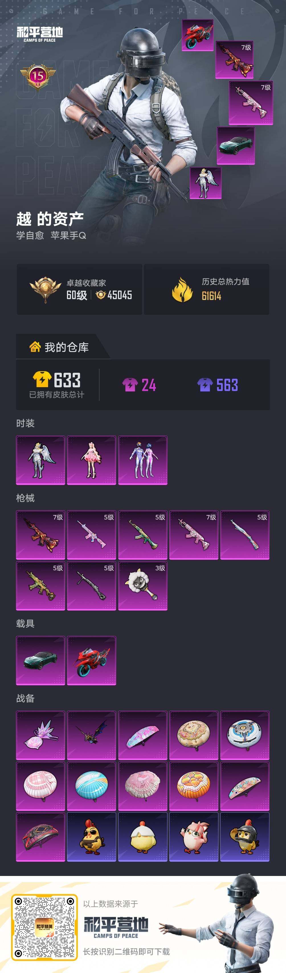 【特价出售/店主推荐】苹果 手Q-3粉装-8特效枪-2载具-2粉色飞行器-61614热力值-15王牌印记-118套装-198枪皮【热门品类】:粉装-梦幻火箭,套装-龟仙人【粉色套装】:粉装-梦幻火箭,角色-樱桃泡泡,角色-天鹅座 冰河【粉色枪皮等级】:AKM-绿萝繁花(五级),M416-风花雪月(七级),M416-电玩时刻(五级),M762-甜蜜誓约(七级),AKS-74U-森灵之息(五级),K