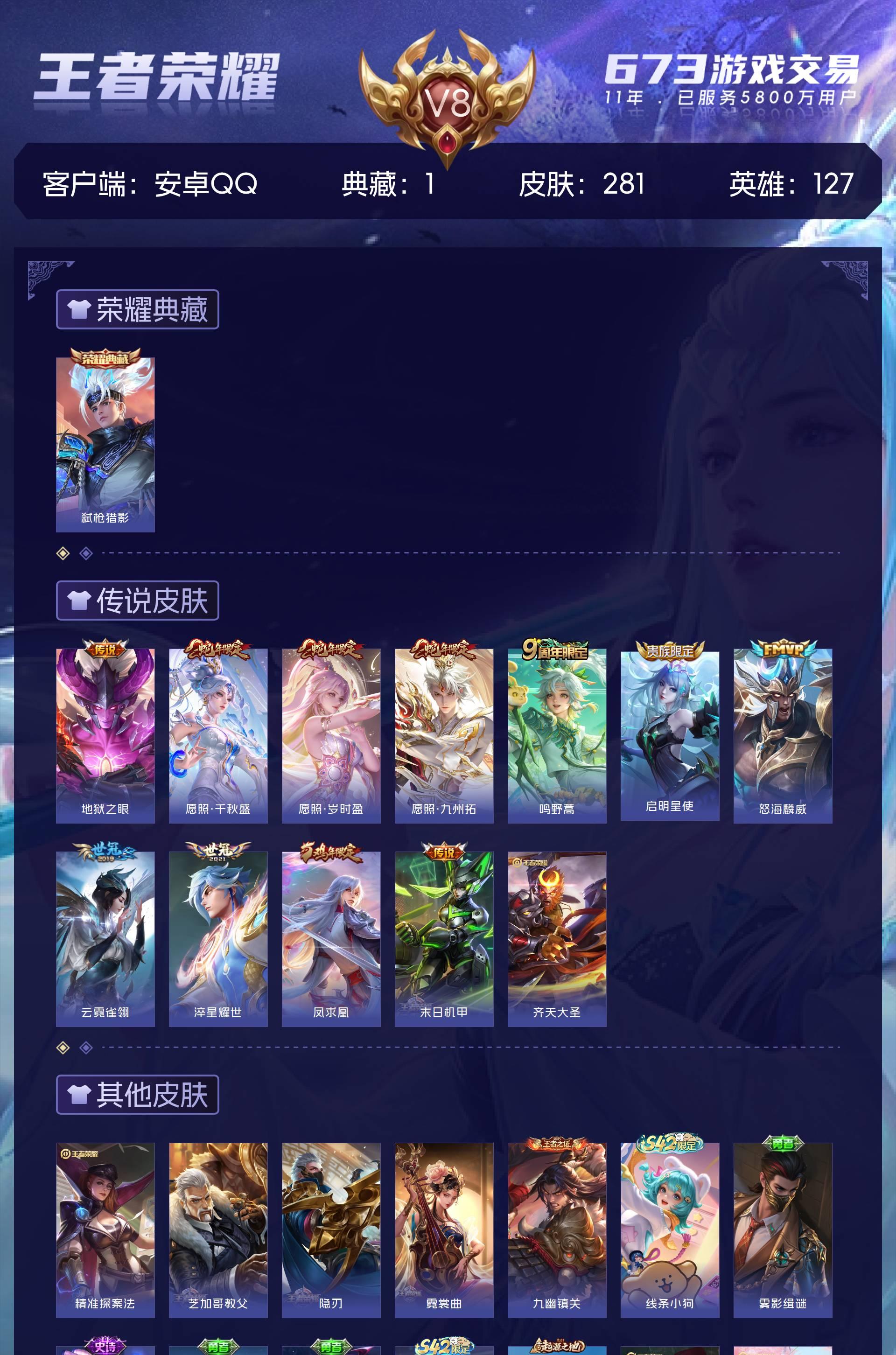 V8 皮肤281 英雄127 最强王者 荣耀典藏1 星传说2 传说13 其他皮肤274