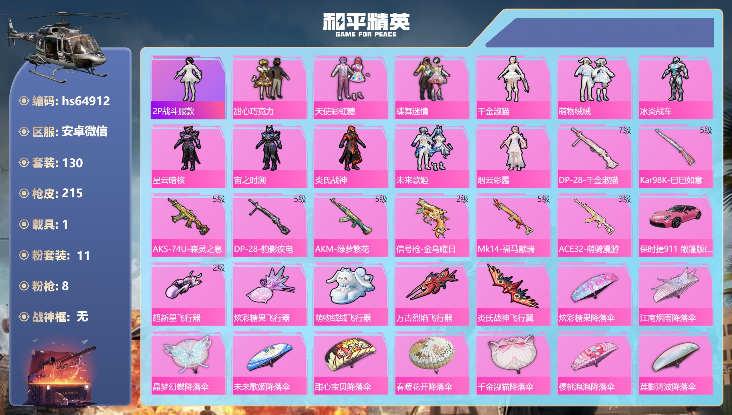 hs64912 安卓微信-5王牌印记-11粉装-8特效枪-1载具-65216热力值-130套装-215枪皮-4卓越印记
