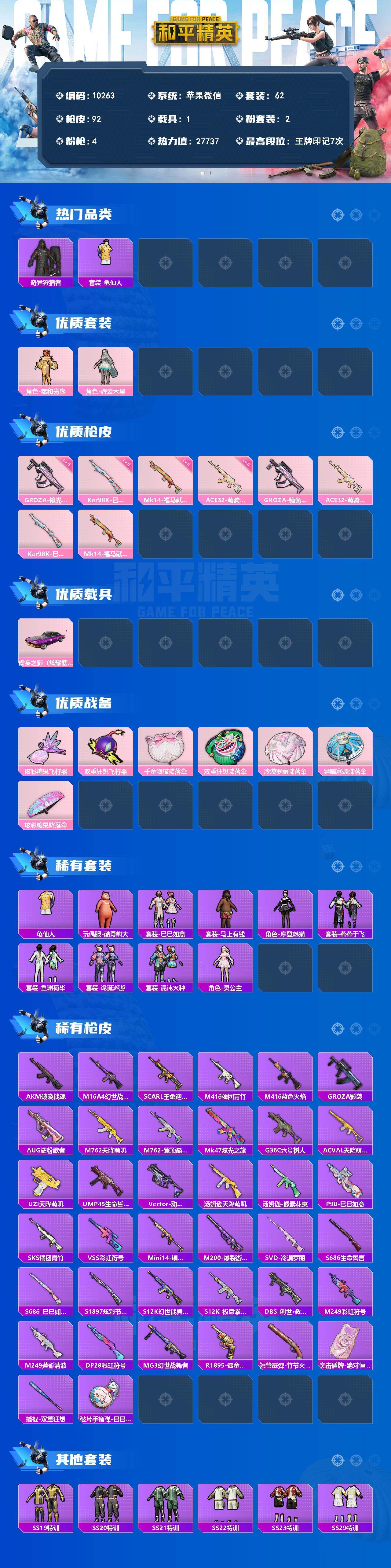 小女号!裙子号!苹果 微信-2粉装-4特效枪-1载具-2粉色飞行器-27737热力值-7王牌印记-62套装-92枪皮
