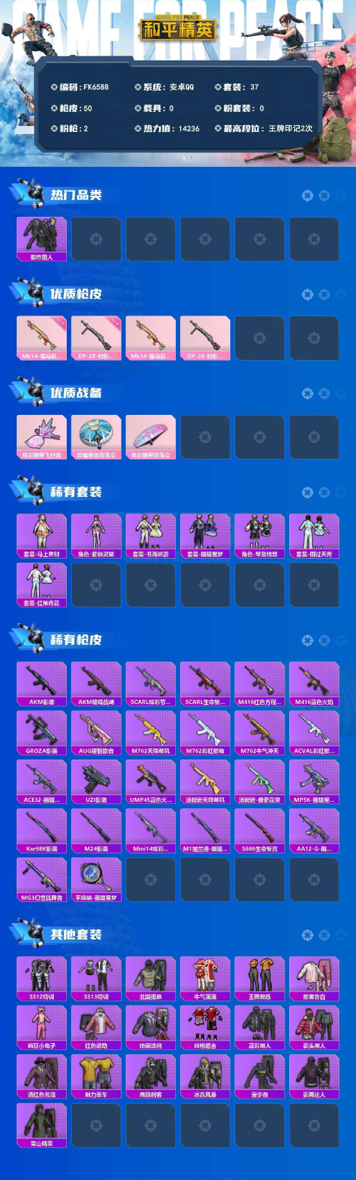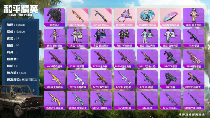 材号-都市猎人-双字ID-街舞达人-2特效枪】安卓 手Q-0粉装-2特效枪-0载具-1粉色飞行器-14236热力值-2王牌印记-37套装-50枪皮 【热门品类】:套装-都市猎人 【粉色枪皮等级】:Mk14-福马献瑞(五级),DP-28-豹影疾电(四级) 【粉色枪皮】:Mk14-福马献瑞,DP-28-豹影疾电 【粉色飞行器】:炫彩糖果飞行器 【粉色降落伞】:异瞳寒姬降落伞,炫彩糖