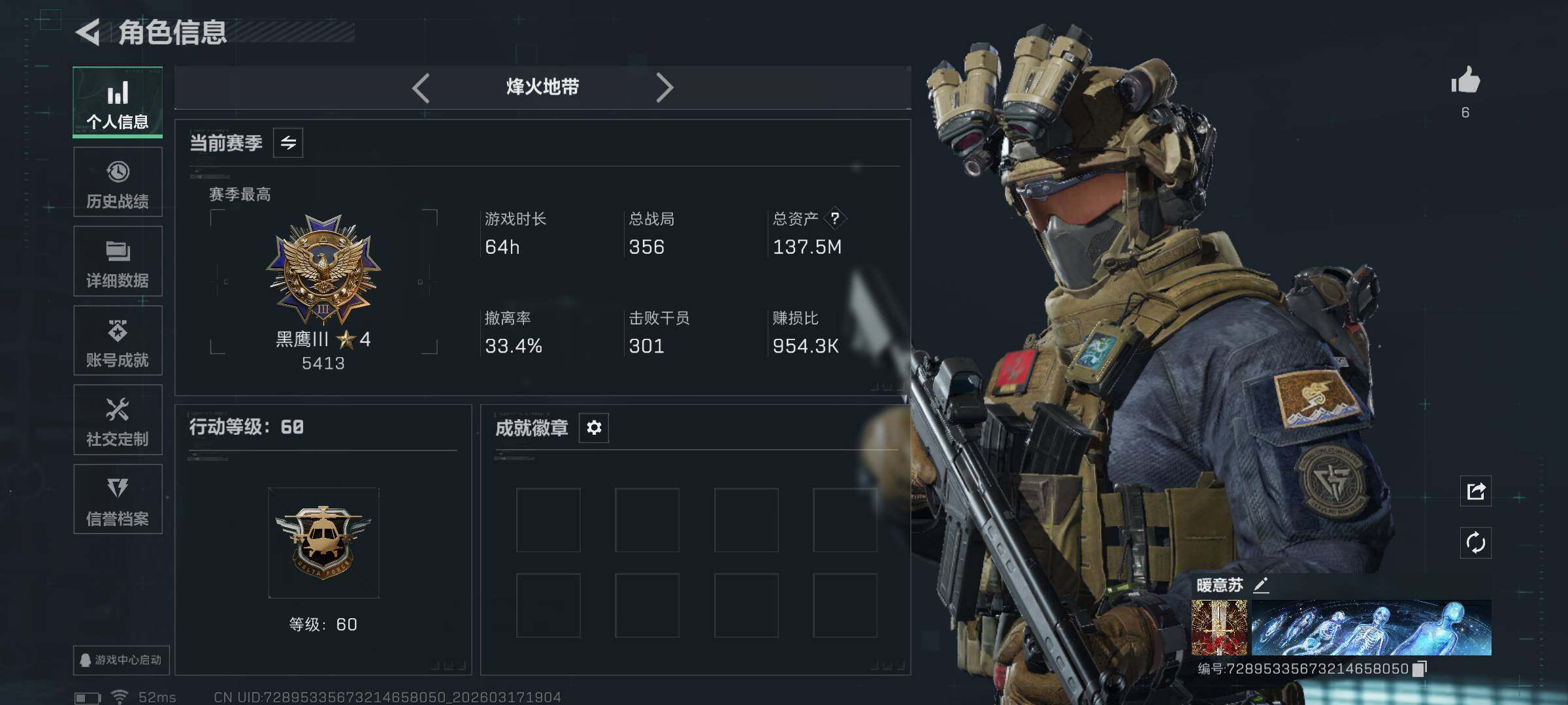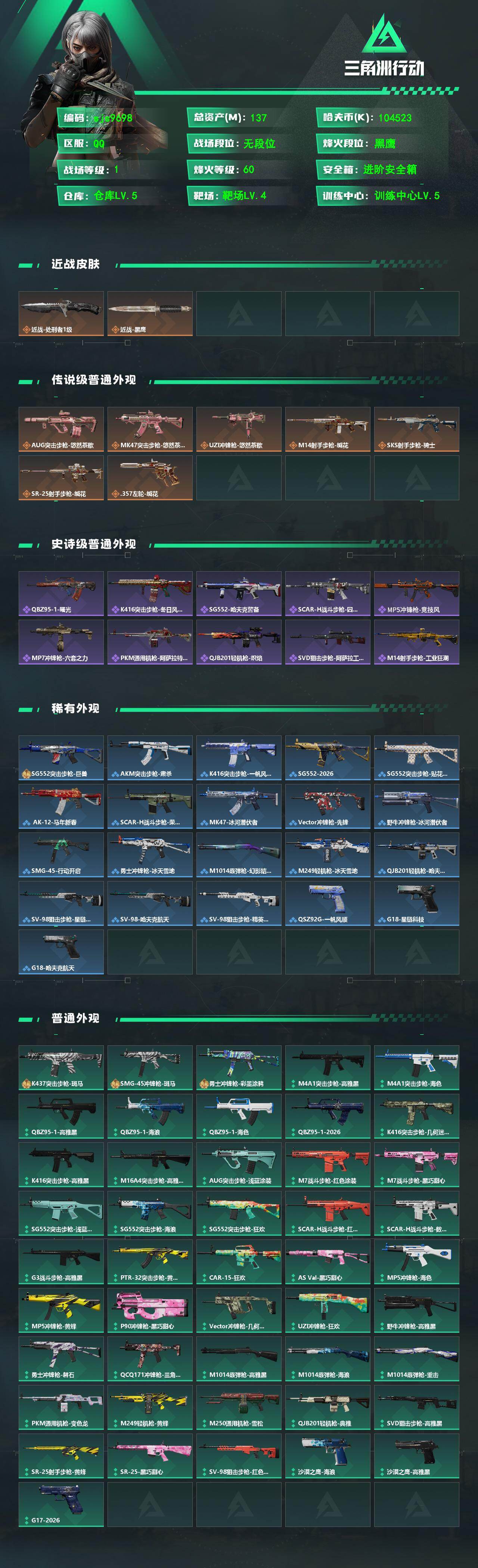 137m总资产-104523k哈伏币-60烽火等级-黑鹰-1战场等级-无军衔
