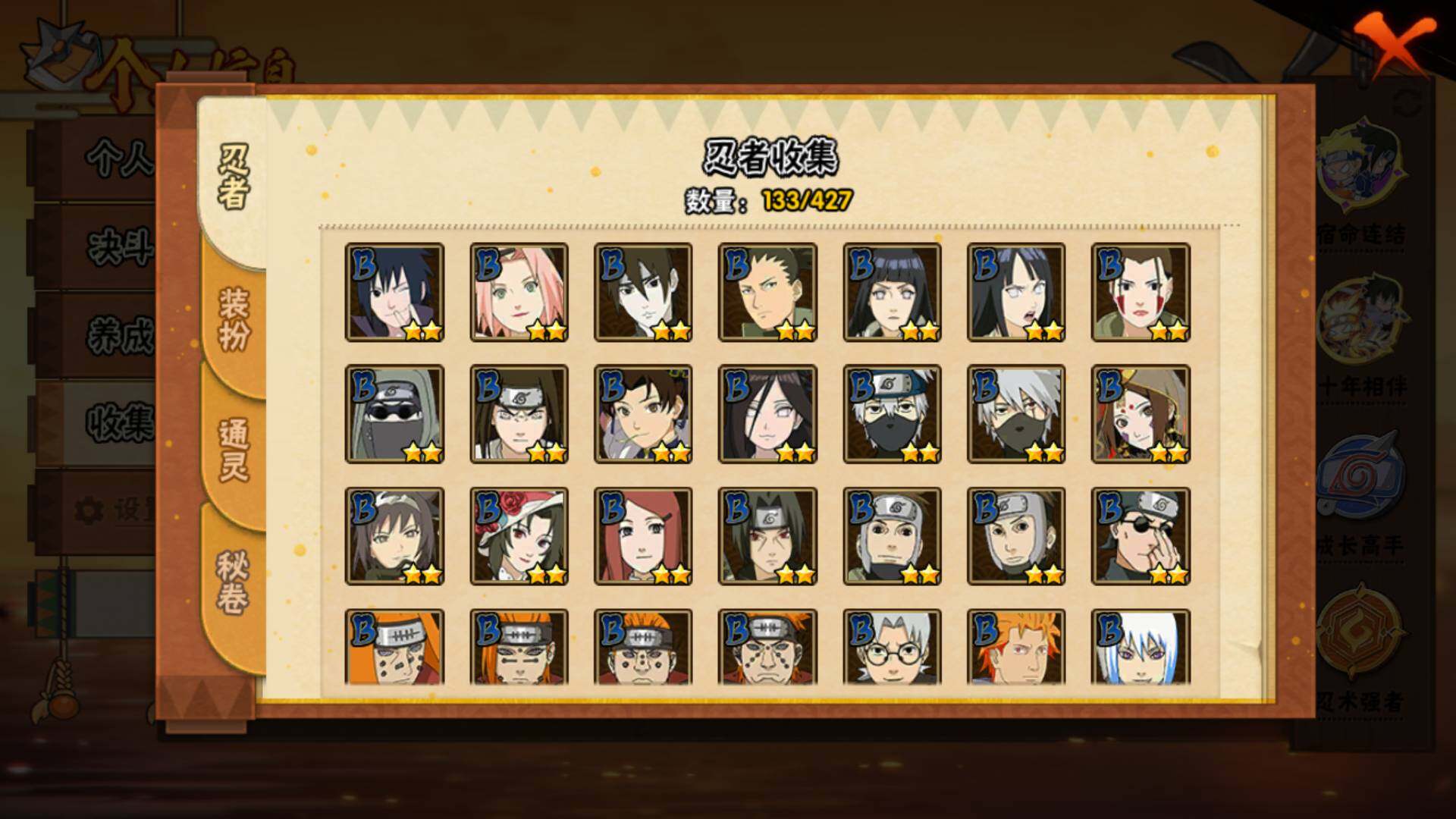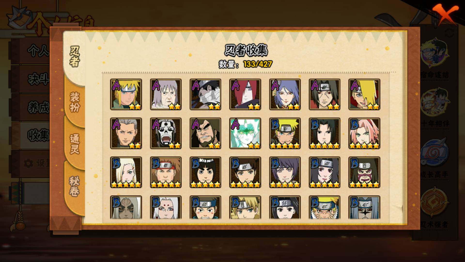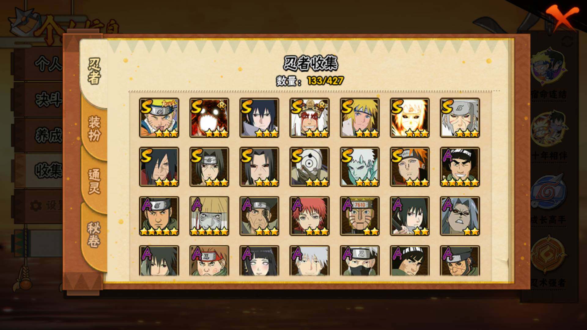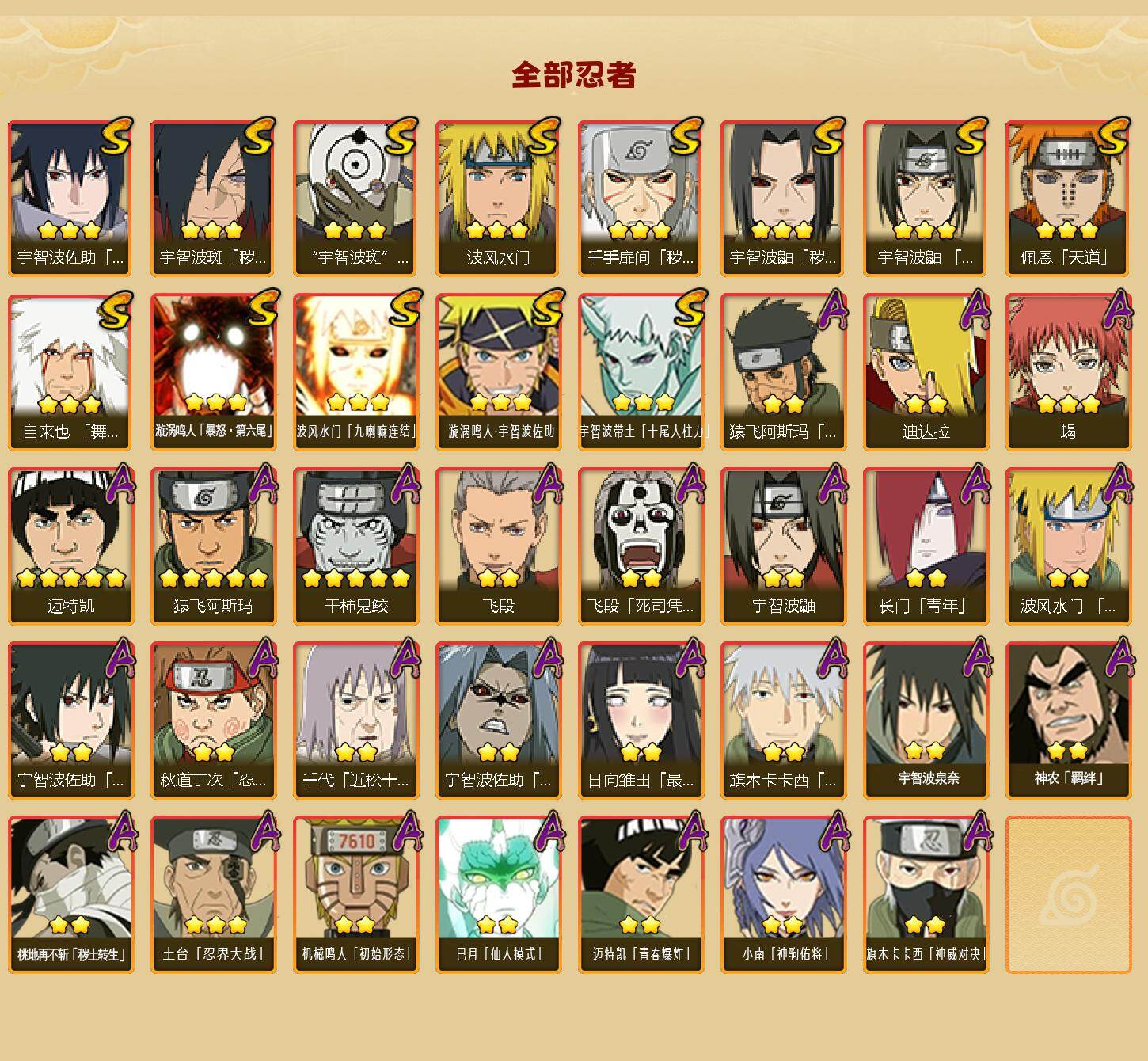 【S级忍者】:千手扉间「秽土转生」(3星),宇智波鼬「秽土转生」(3星),宇智波斑「秽土转生·解」(3星),宇智波鼬「须佐能乎」(3星),自来也「舞之豪杰」(3星),波风水门(3星),佩恩「天道」(3星),宇智波佐助「永恒万花筒」(3星),宇智波斑 「白面具」(3星宇智波斑「白面具」)
