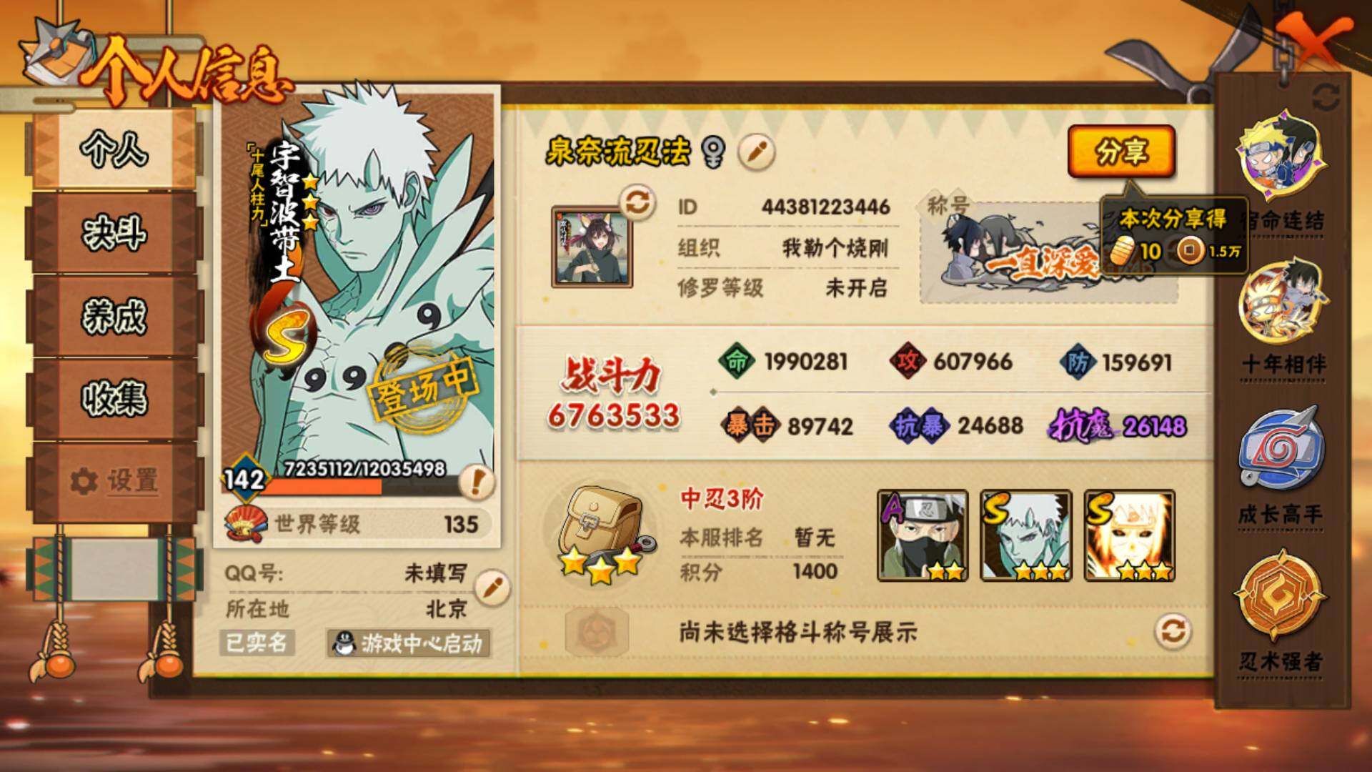 (可免费转苹果)V7,战力676W,13S级忍者数-26A级忍者数,1210点
