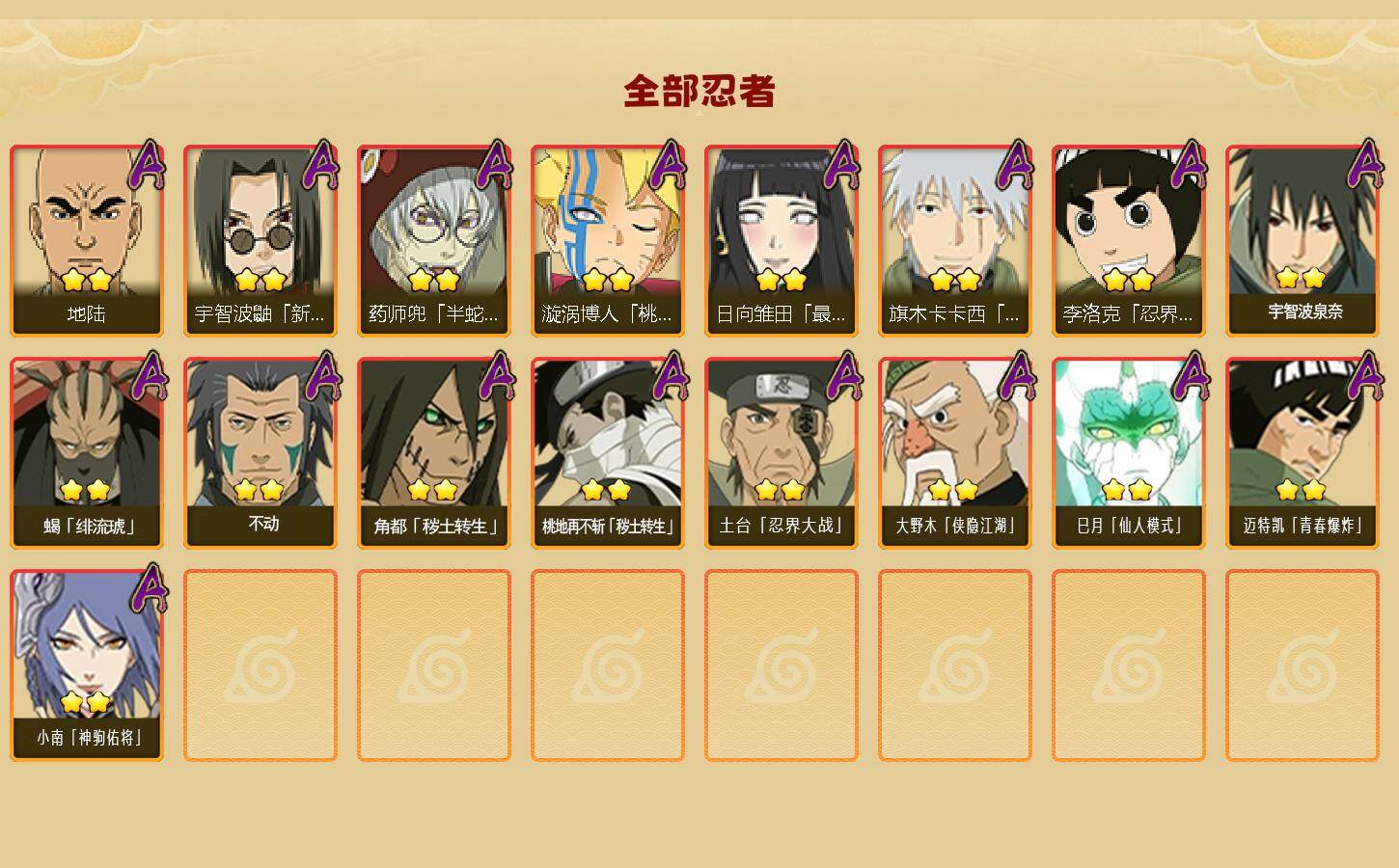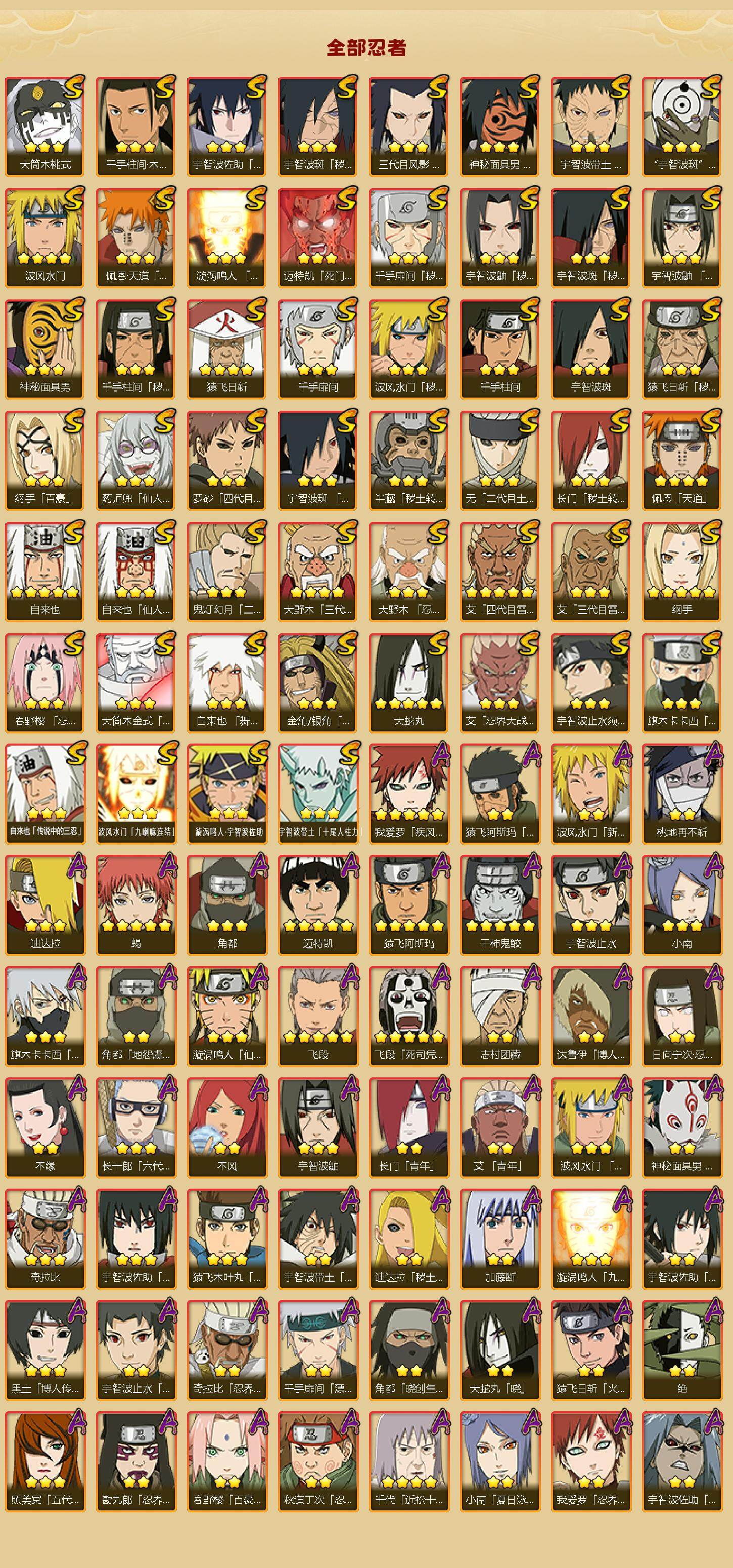 52S级忍者数-69A级忍者数【S级忍者】:长门「秽土转生」(3星),三代目风影「秽土转生」(3星),半藏「秽土转生」(3星),金角·银角「秽土转生」(3星),猿飞日斩「秽土转生」(3星),波风水门「秽土转生」(3星),千手扉间「秽土转生」(3星),千手柱间「秽土转生」(3星),宇智波鼬「秽土转生」(3星),宇智波斑「秽土转生」(3星),宇智波斑「秽土转生·解」(3星),大野木「忍界大战」(3星),春野樱「忍界大战」(3星),宇智波带土「忍界大战」(3星),艾「忍界大战」(3星),宇智波鼬「须佐