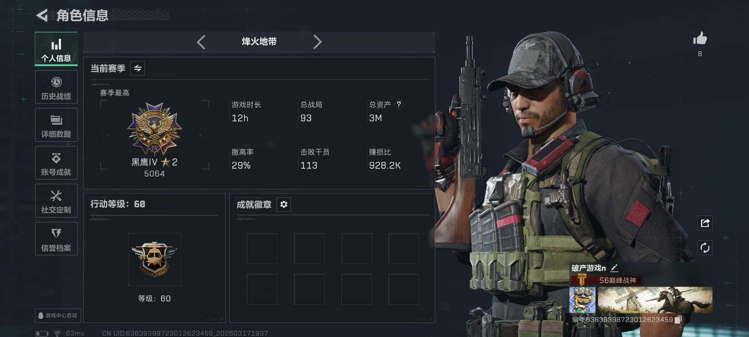 3m总资产-9k哈伏币-60烽火等级-黑鹰-1战场等级-无军衔