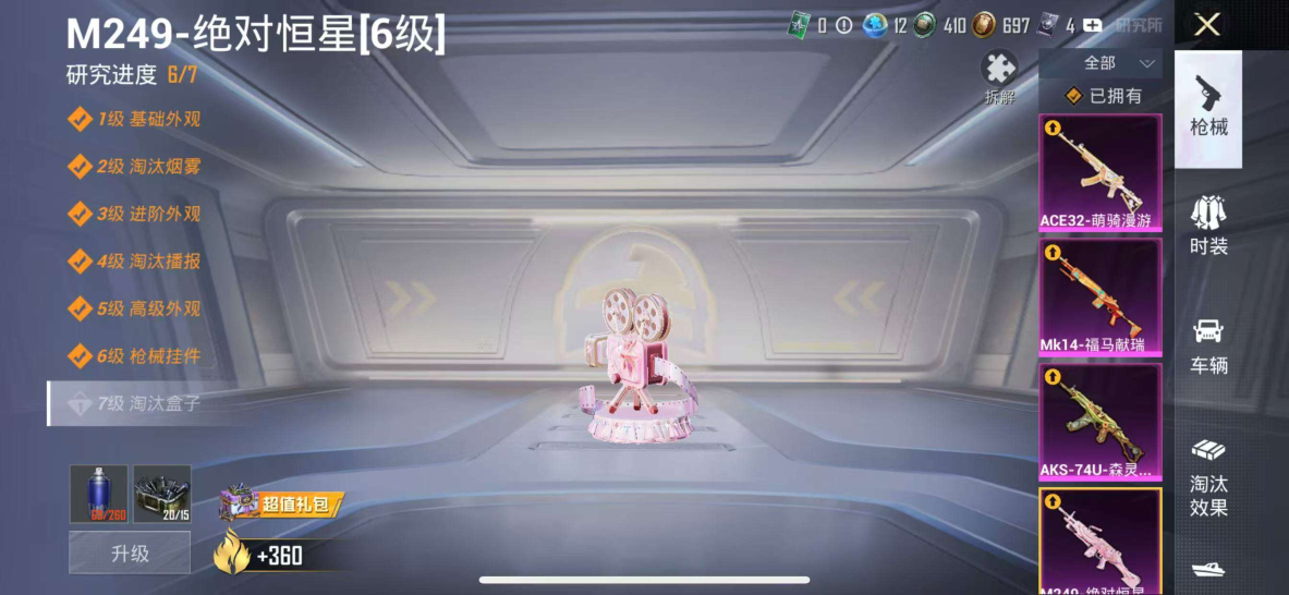 箭101-洛天依-绝对恒星-六级M249-绝对恒星-3粉装5特效枪3飞行器-身法素材号】苹果 手Q-3粉装-5特效枪-0载具-3粉色飞行器-21956热力值-3王牌印记-43套装-77枪皮 【热门品类】:粉装-梦幻火箭 【粉色套装】:角色-绝对恒星,粉装-梦幻火箭,角色-洛天依 【粉色枪皮等级】:ACE32-萌骑漫游(五级),AKS-74U-森灵之息(五级),Kar98K-巳巳