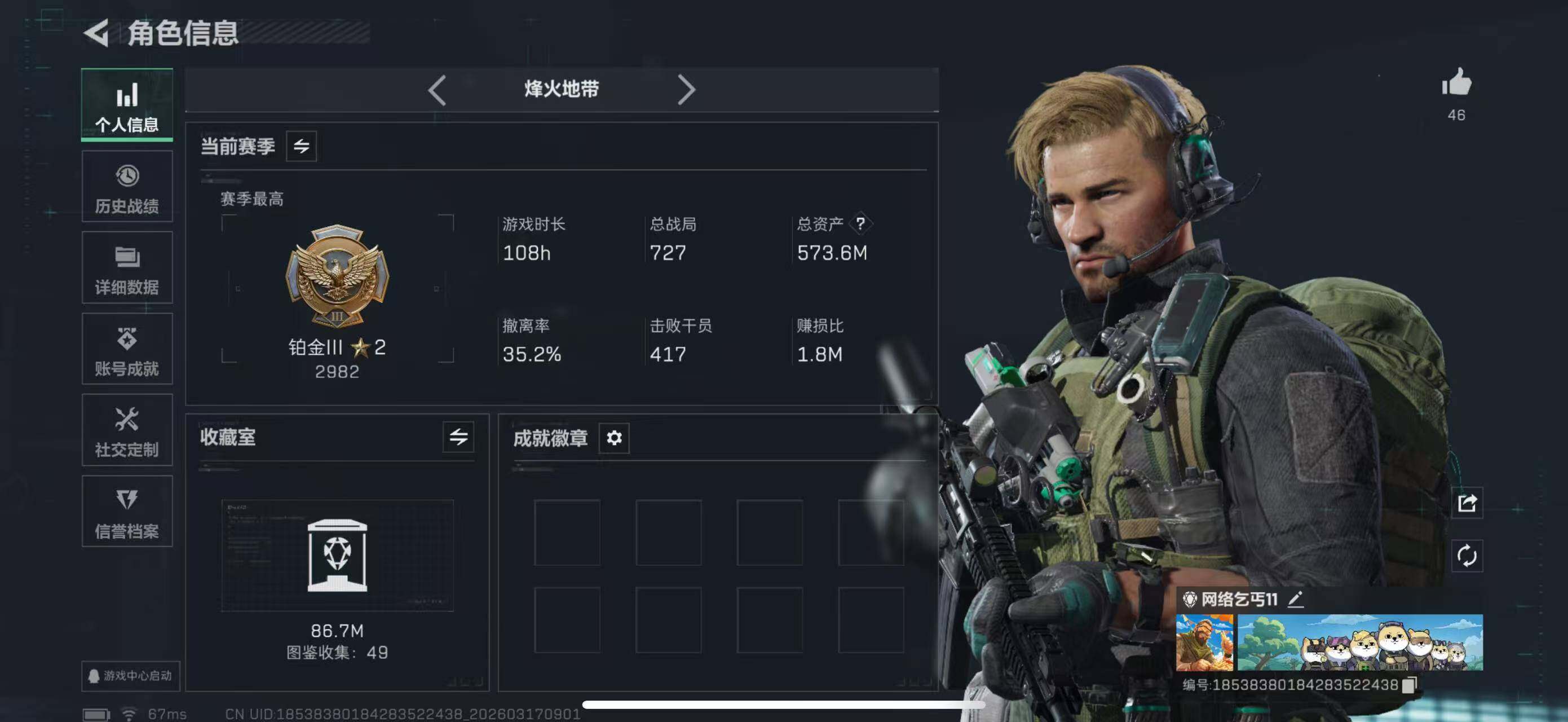 573m总资产-207195k哈伏币-60烽火等级-铂金-13战场等级-列兵