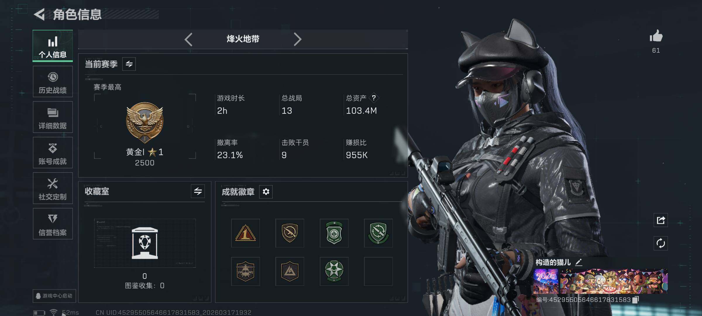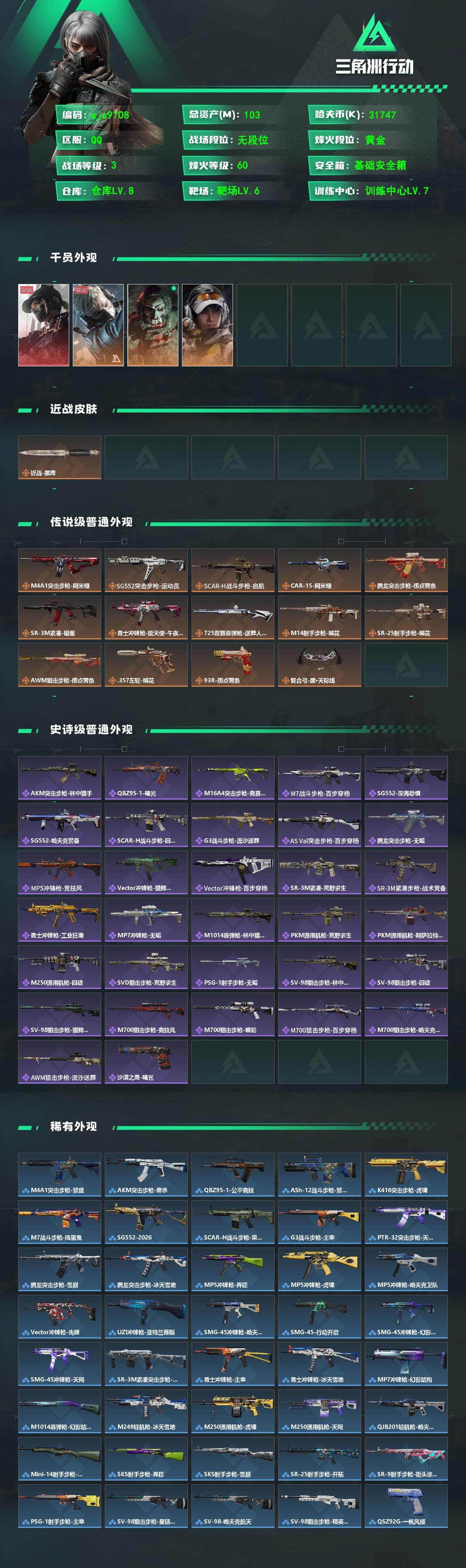 103m总资产-31747k哈伏币-60烽火等级-黄金-3战场等级-无军衔