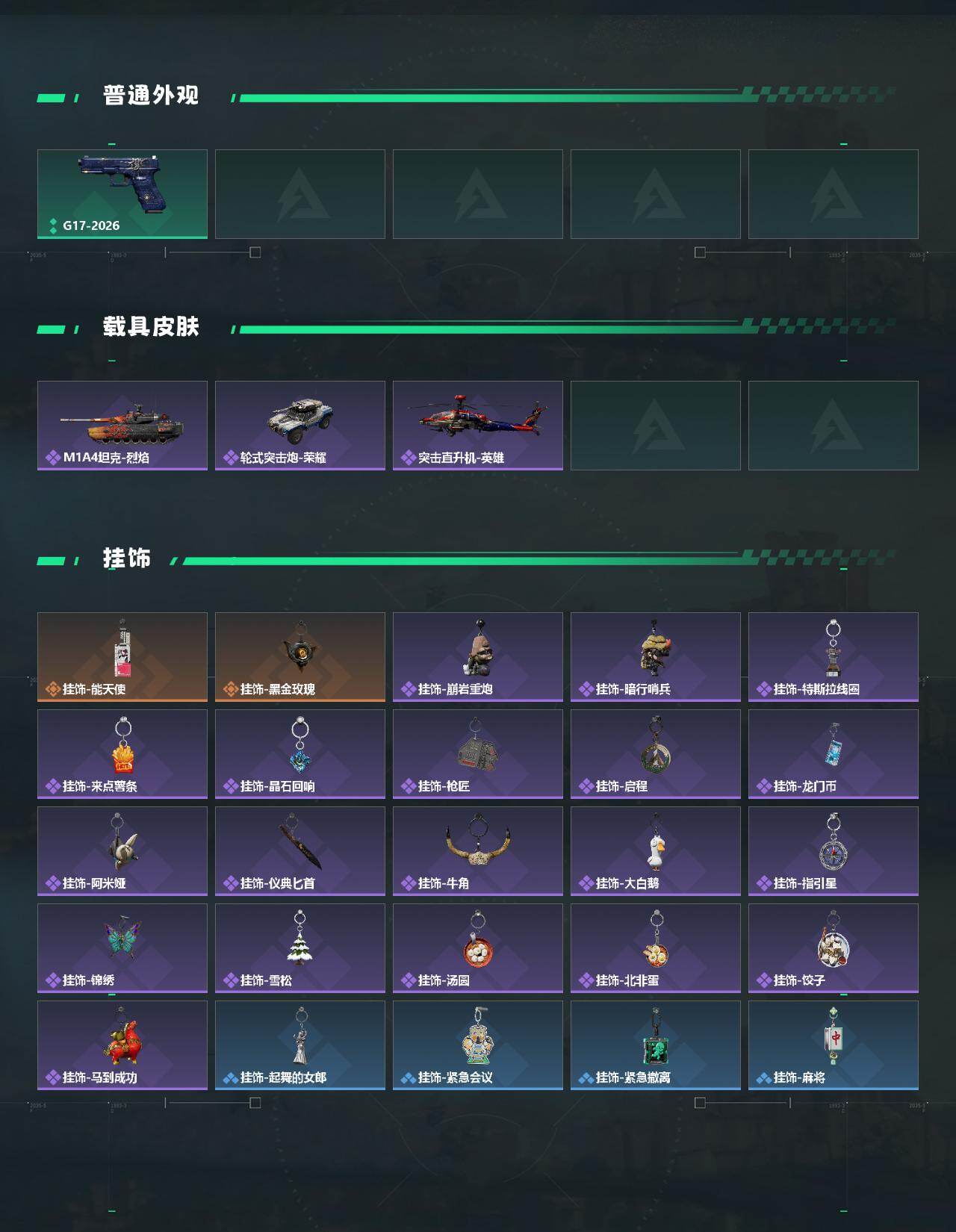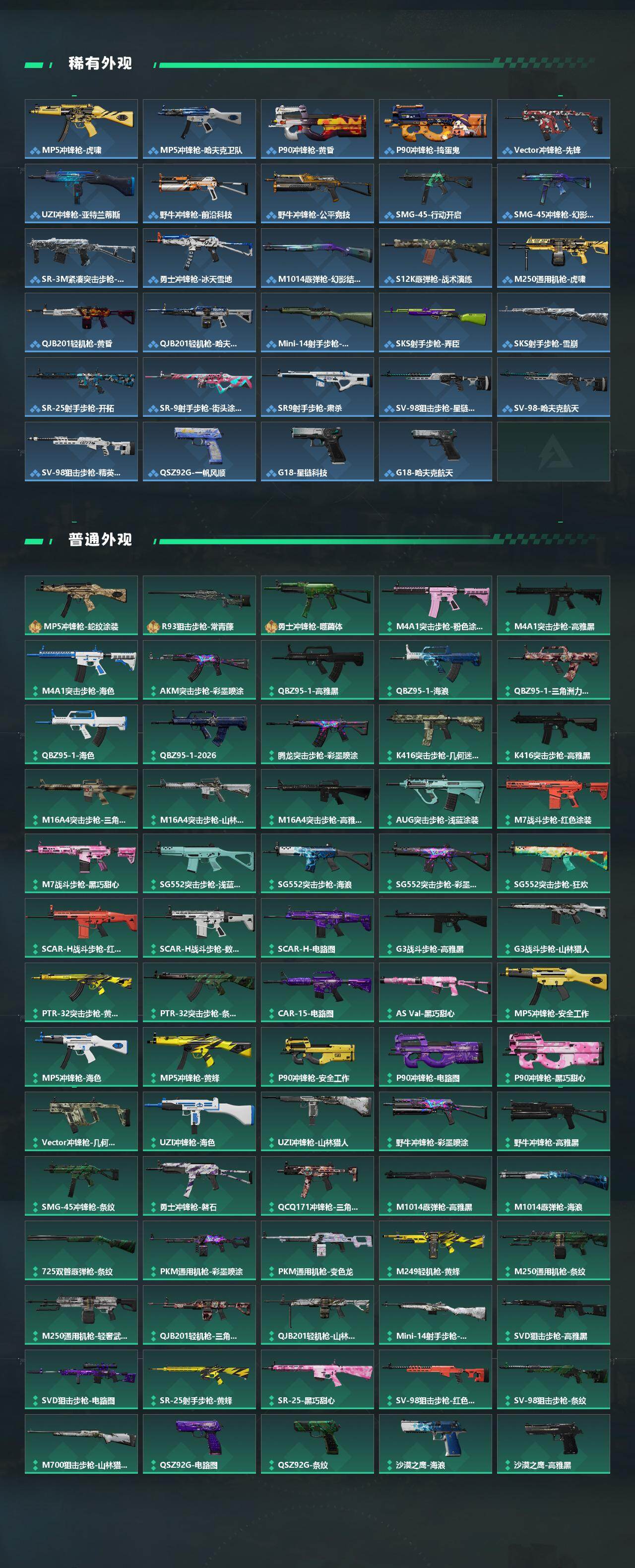 【传说外观】:M4A1突击步枪-蚀金玫瑰,M4A1突击步枪-阿米娅,AKM突击步枪-锦绣,ASh-12战斗步枪-鹅鸭杀,AK-12突击步枪-特斯拉线圈,SCAR-H战斗步枪-启航,G3战斗步枪-骑士,CAR-15突击步枪-阿米娅,腾龙突击步枪-捞点薯条,腾龙突击步枪-马年祥瑞,K437突击步枪-锦绣,KC17突击步枪-电锯惊魂