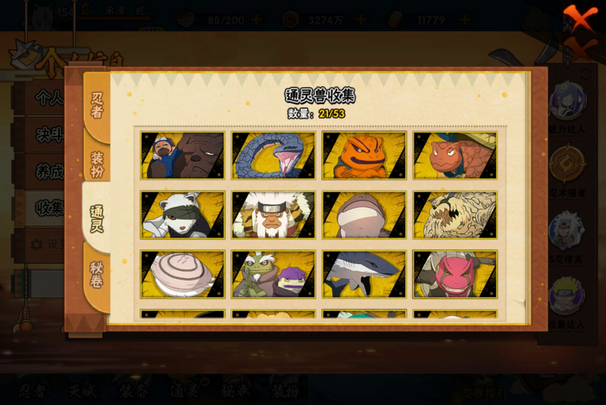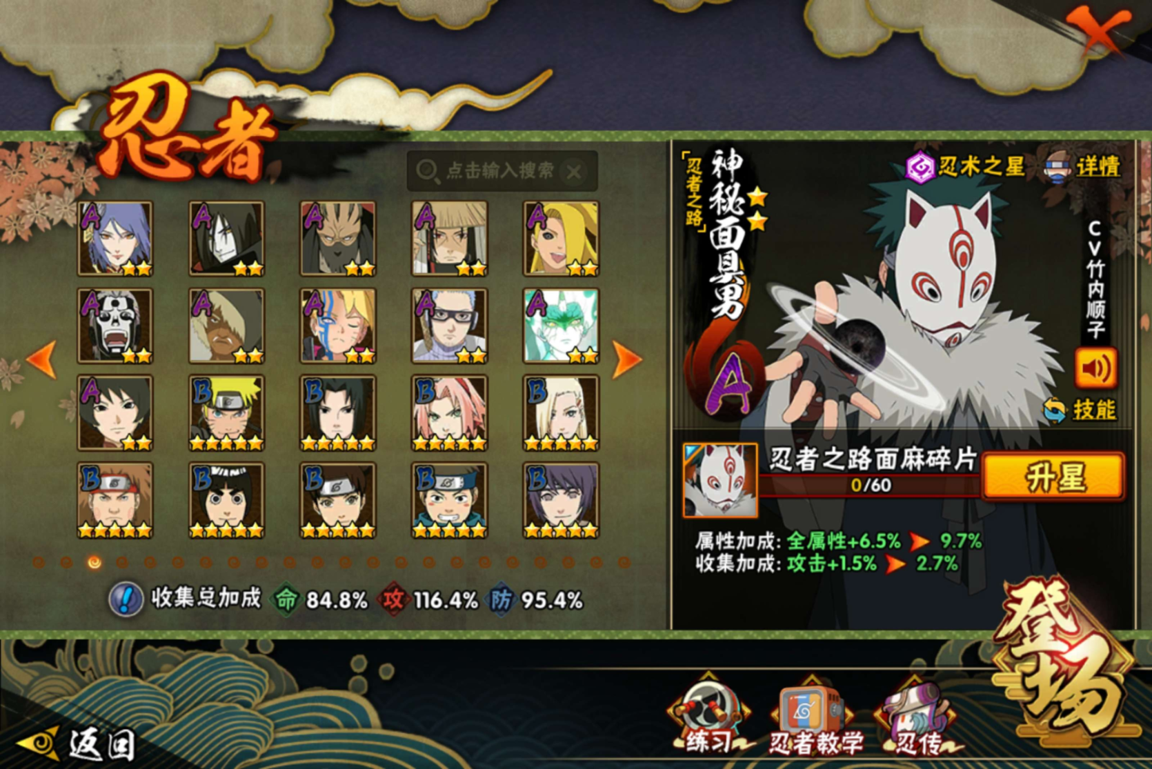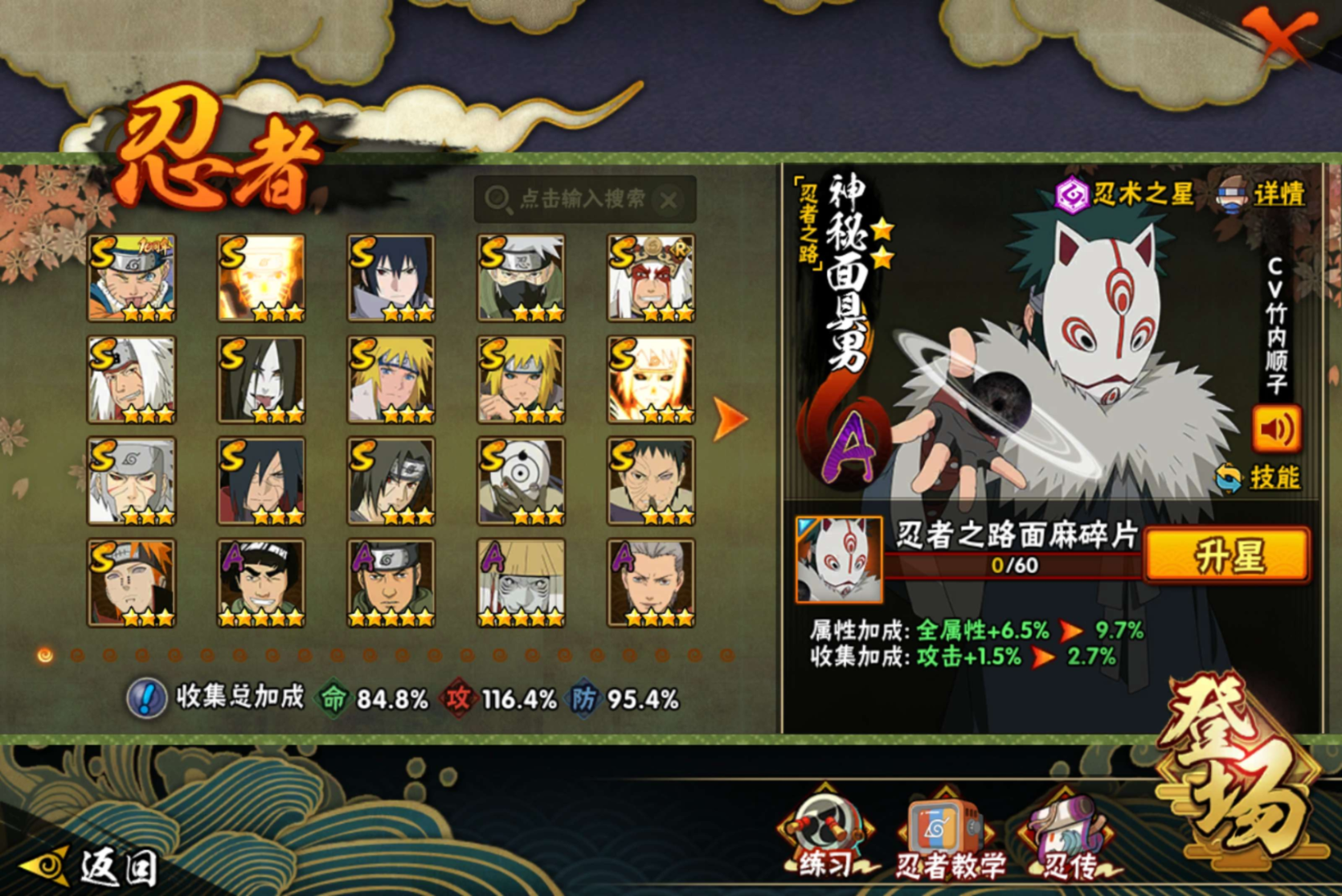【S级忍者】宇智波带土「忍界大战」(3星),旗木卡卡西「须佐能乎」(3星),自来也「传说中的三忍」(3星),宇智波斑「秽土转生·解」(3星),宇智波佐助「永恒万花筒」