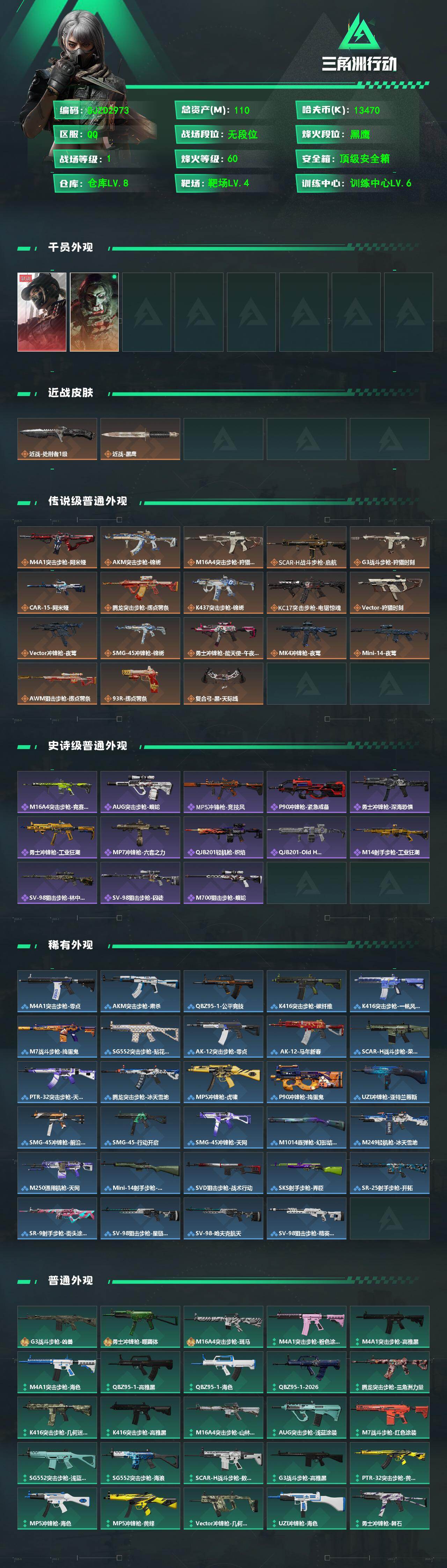 【SJZD2973】总资产(M):110M/哈夫币(K):13470K/哈夫币(K):13470K/传说枪皮数:18/全面战场等级:1_段位:无段位/烽火地带等级:60_段位:黑鹰/露娜-黑·天际线/红狼-电锯惊魂/近战-处刑者1级/近战-黑鹰/M4A1突击步枪-阿米娅/AKM突击步枪-锦绣/M16A4突击步枪-狩猎时刻/SCAR-H战斗步枪-启航/G3战斗步枪-狩猎时刻/CAR-15突击步枪-阿米娅/腾龙突击步枪-捞点薯条/K437突击步枪-锦绣/KC17突击步枪-电锯惊魂/Vector冲锋枪