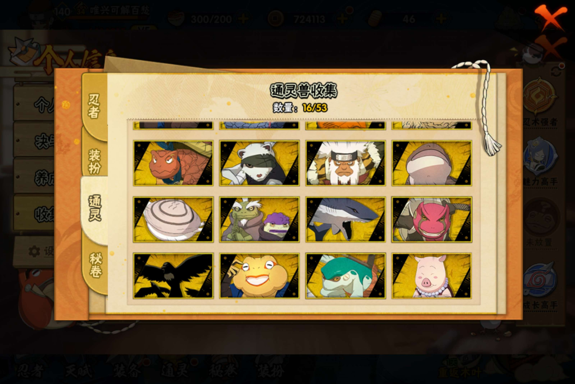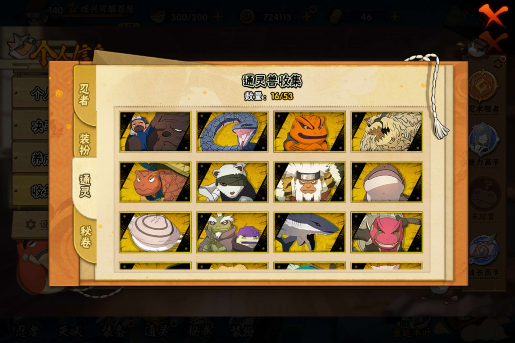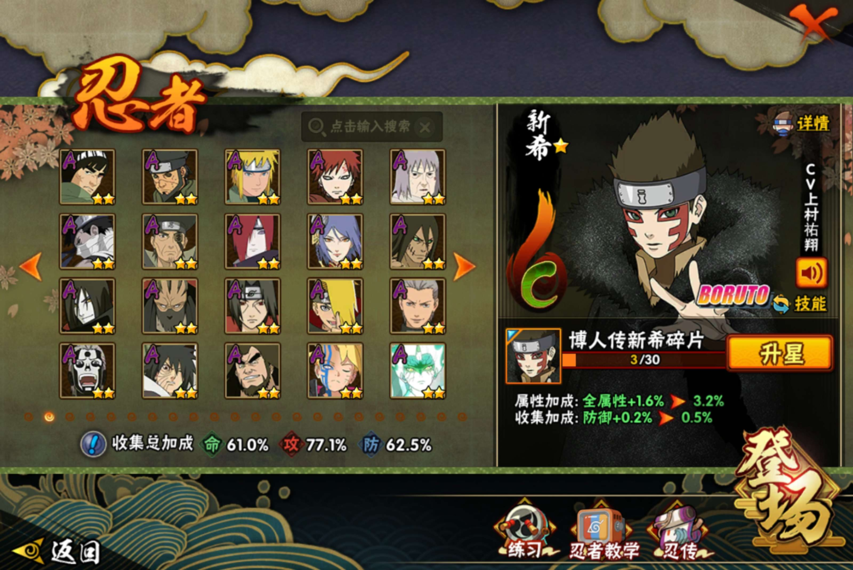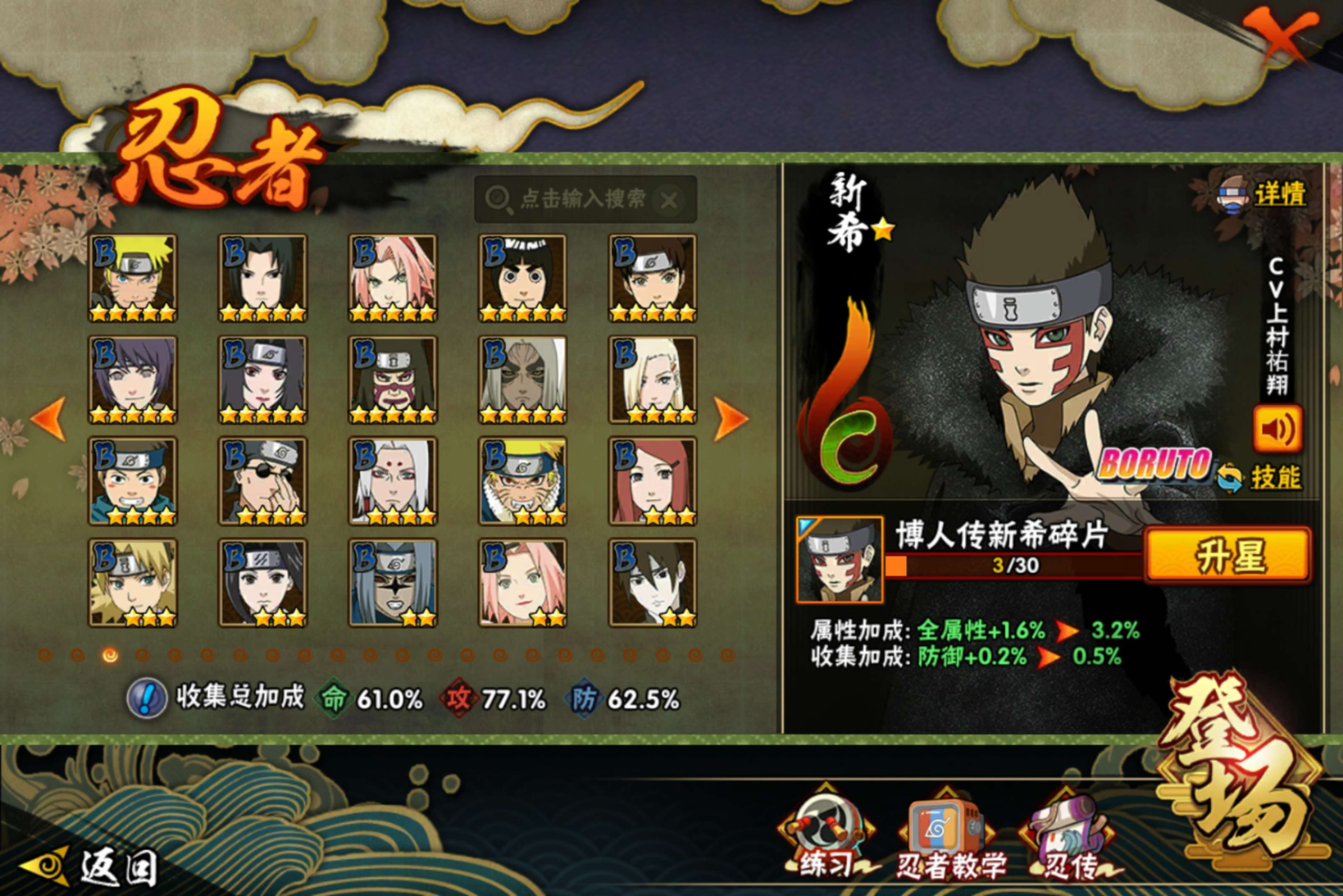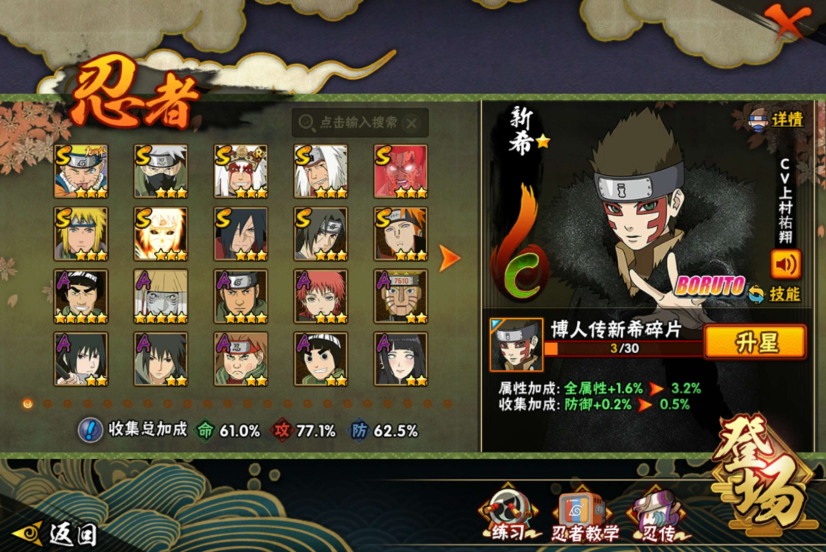 【S级忍者】迈特凯「死门」(3星),旗木卡卡西「须佐能乎」(3星),自来也「传说中的三忍」(3星),宇智波斑「秽土转生·解」(3星),波风水门「九喇嘛连结」(3星),自来也「舞之