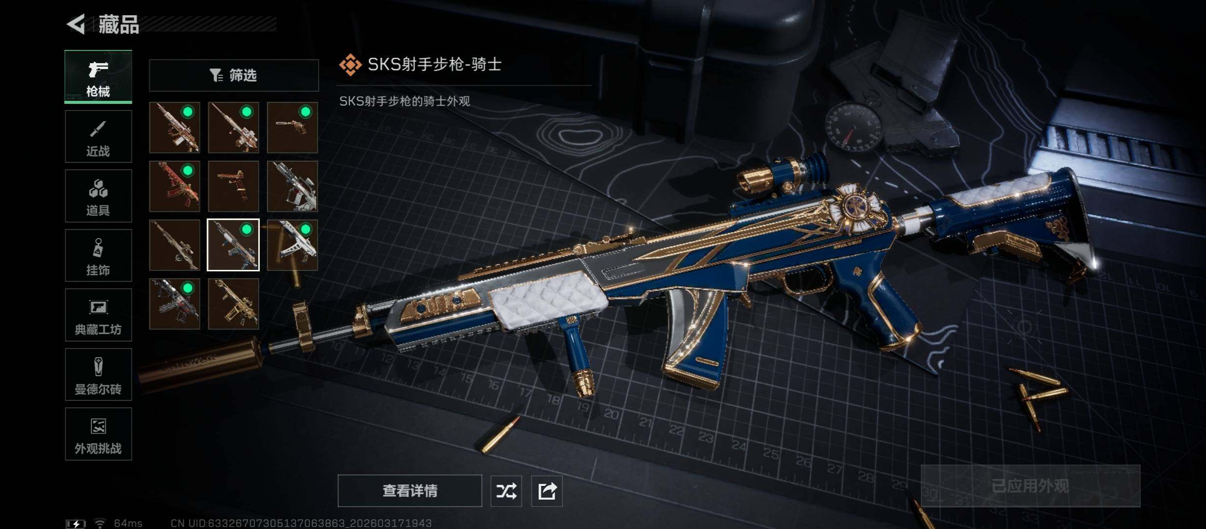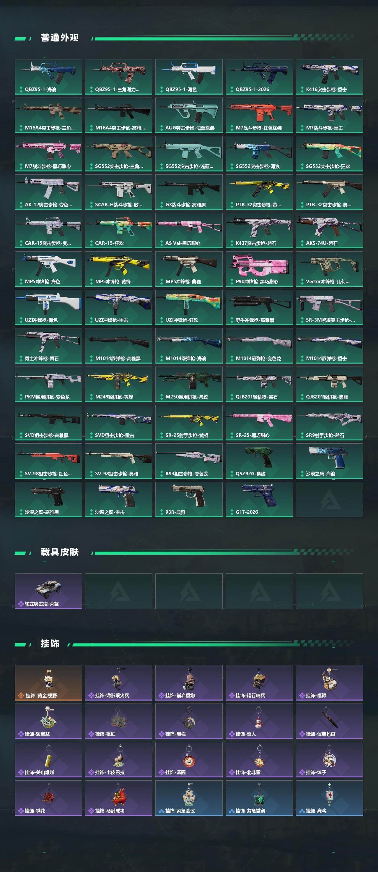 【传说外观】:QBZ95-1突击步枪-凌霄戍卫,SG552突击步枪-运动员,SCAR-H战斗步枪-启航,腾龙突击步枪-马年祥瑞,KC17突击步枪-电锯惊魂,M14射手步枪-蛮荒,M14射手步枪-缄花,SKS射手步