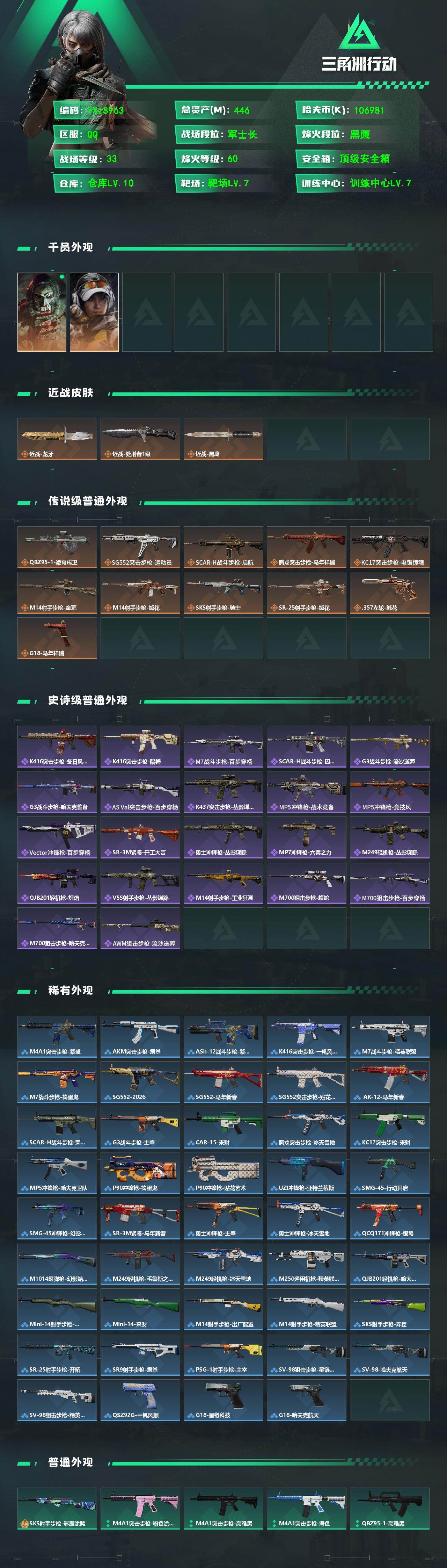 【高额资产446M-双刀皮,龙牙+处刑者,满特勤】【Q区三端互通】【无二次】YXz8963-特勤处:仓库10级/靶场7级/训练中心7级-总资产446m-哈夫币106m-烽火等级:60级