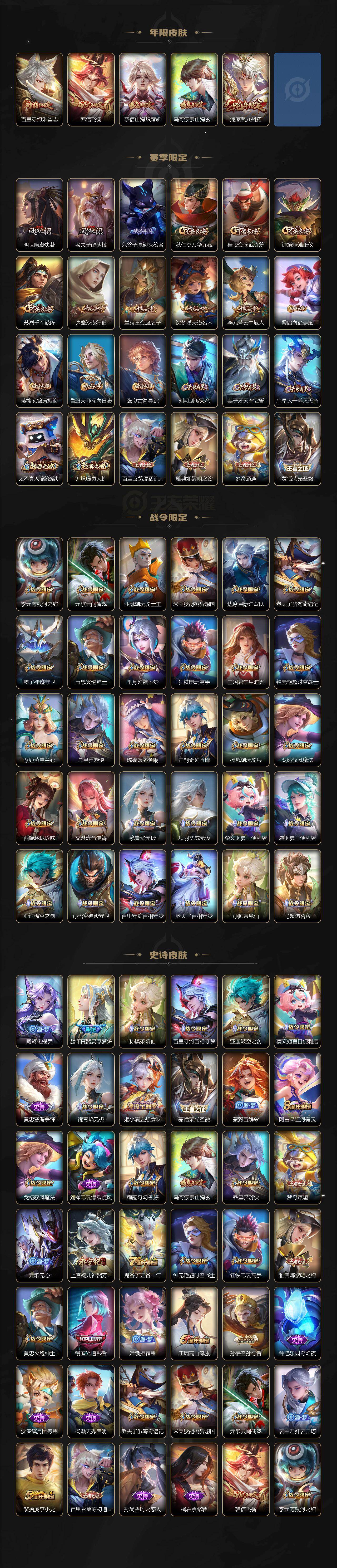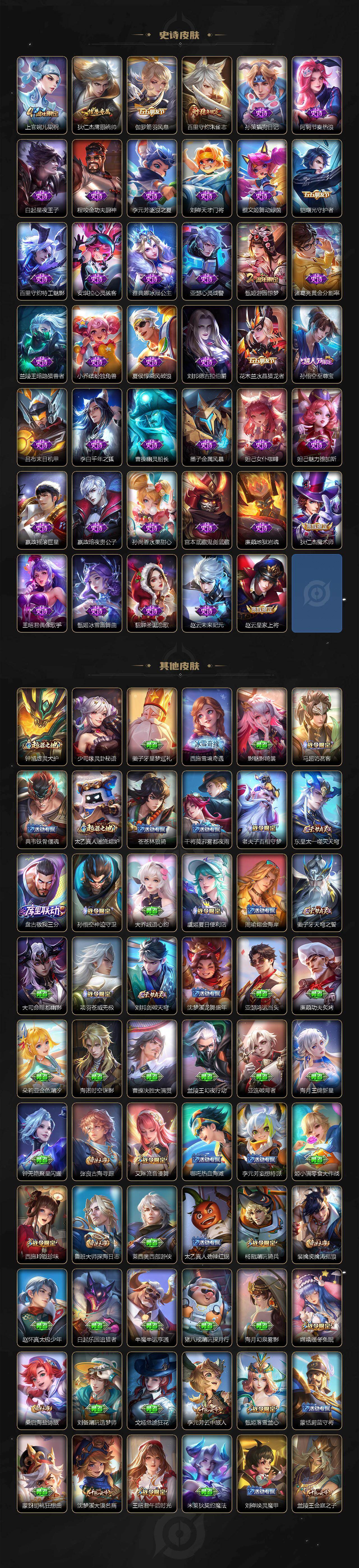 【限定皮肤】:蔡文姬夏日便利店,大乔绒语心约,虞姬夏日便利店,姜子牙天穹之誓,狄仁杰阴阳师,赵云皇家上将,墨子神迹守卫,庄周高山流水,高渐离死亡摇滚,高渐离玩趣恶龙,钟无艳超时空战士,扁鹊奇幻香踪,芈月幻夜卜梦,元歌云间偶戏,元歌无心,甄姬游园惊梦,