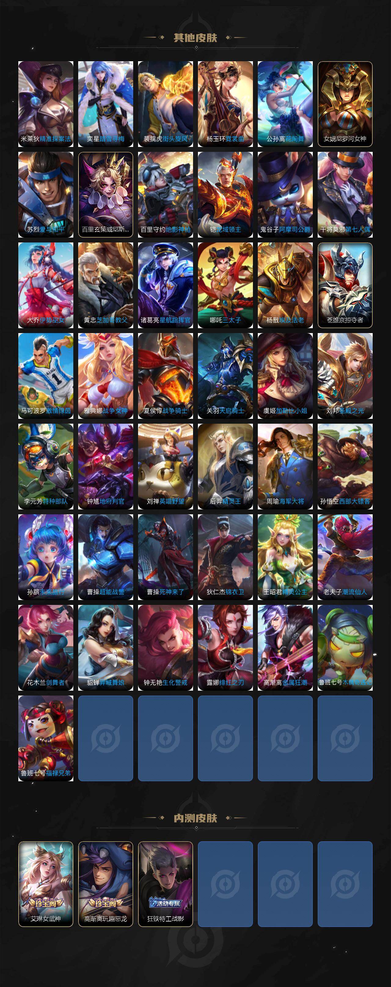 【传说皮肤】:澜愿照九州拓,云缨幻光神枪,桑启鸣野蒿,李信山海炽霜斩,吕布怒海麟威,花木兰冠军飞将,宫本武藏地狱之眼