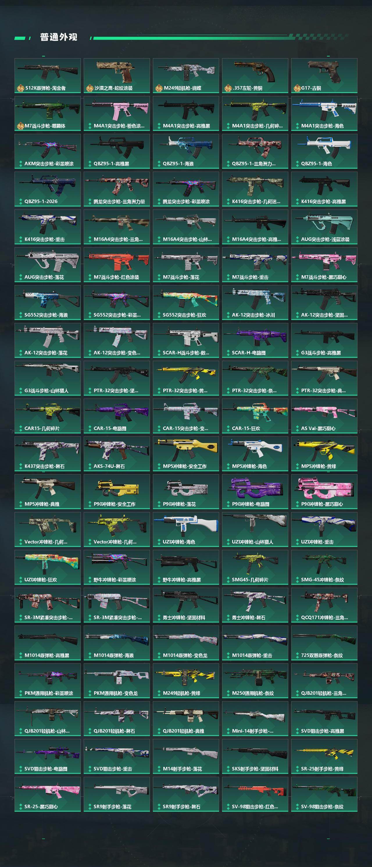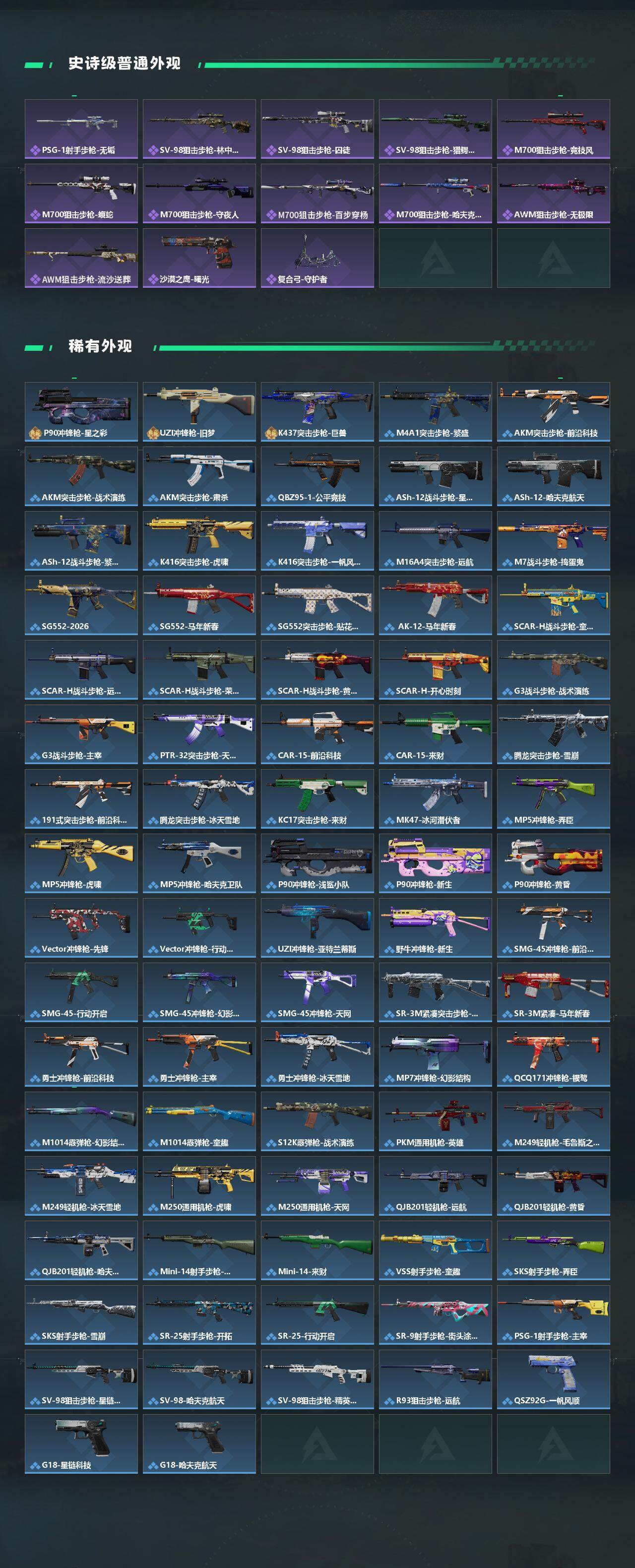 【传说外观】:M4A1突击步枪-阿米娅,AKM突击步枪-锦绣,QBZ95-1突击步枪-凌霄戍卫,SG552突击步枪-运动员,AK-12突击步枪-夜鹰,AK-12突击步枪-特斯拉线圈,SCAR-H战斗步枪-启航,CAR-15突击步枪-阿米娅