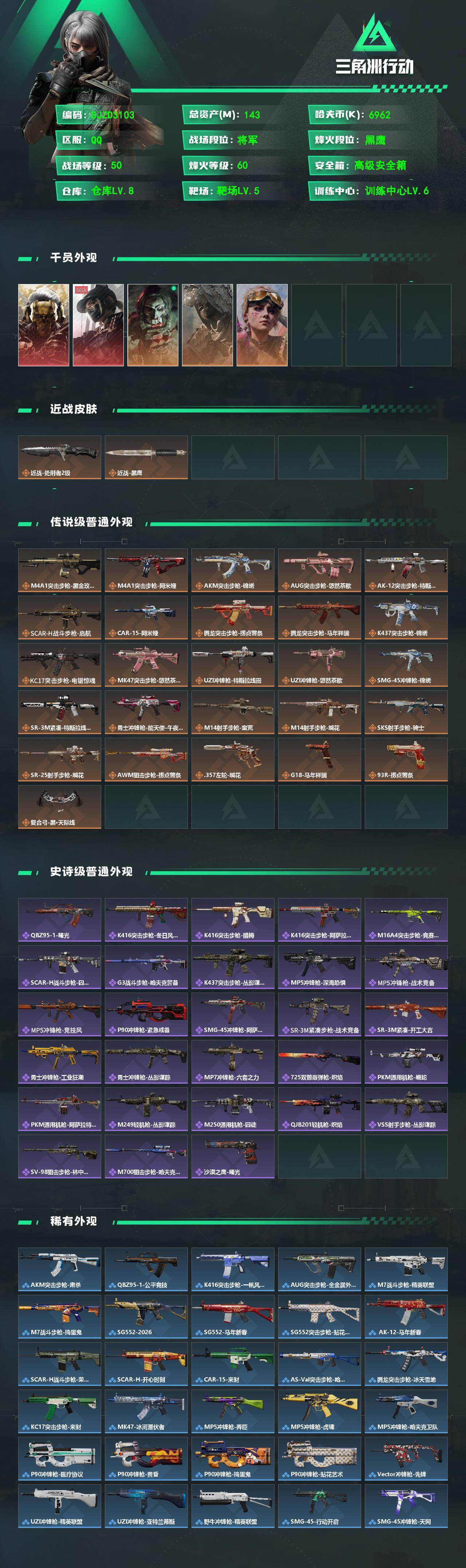 143m总资产-6962k哈夫币-60烽火等级-黑鹰-50战场等级-将军【干