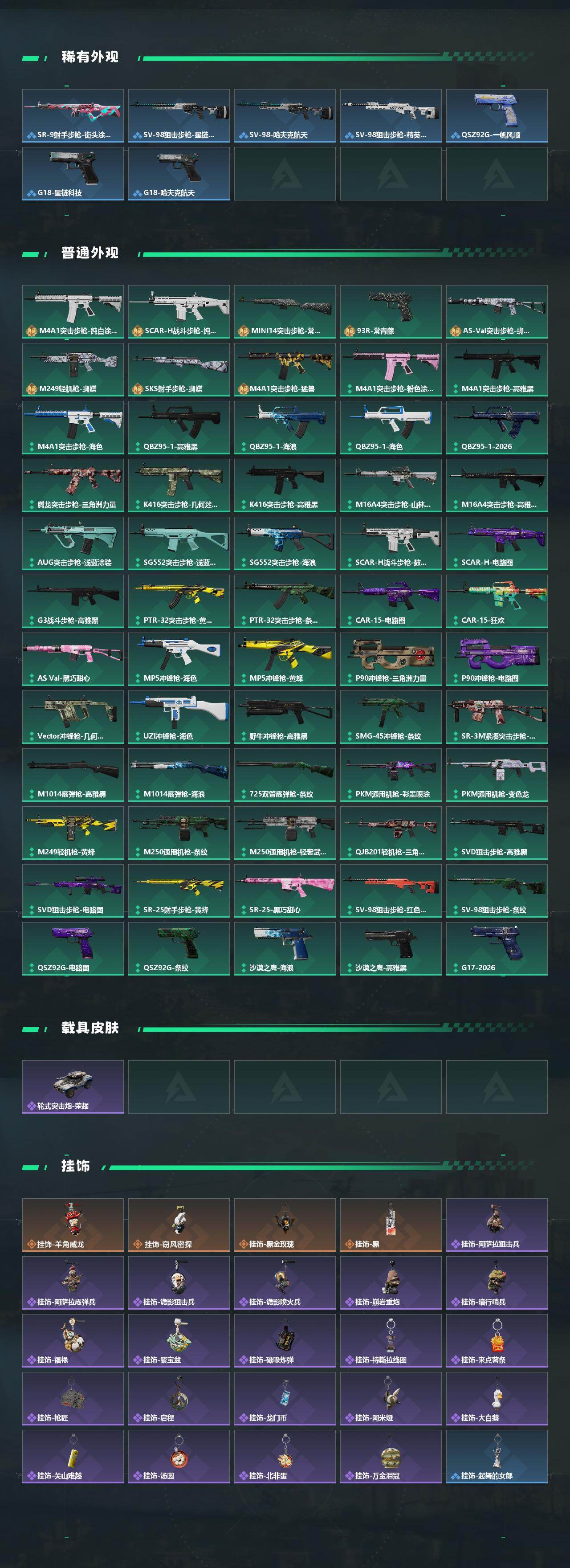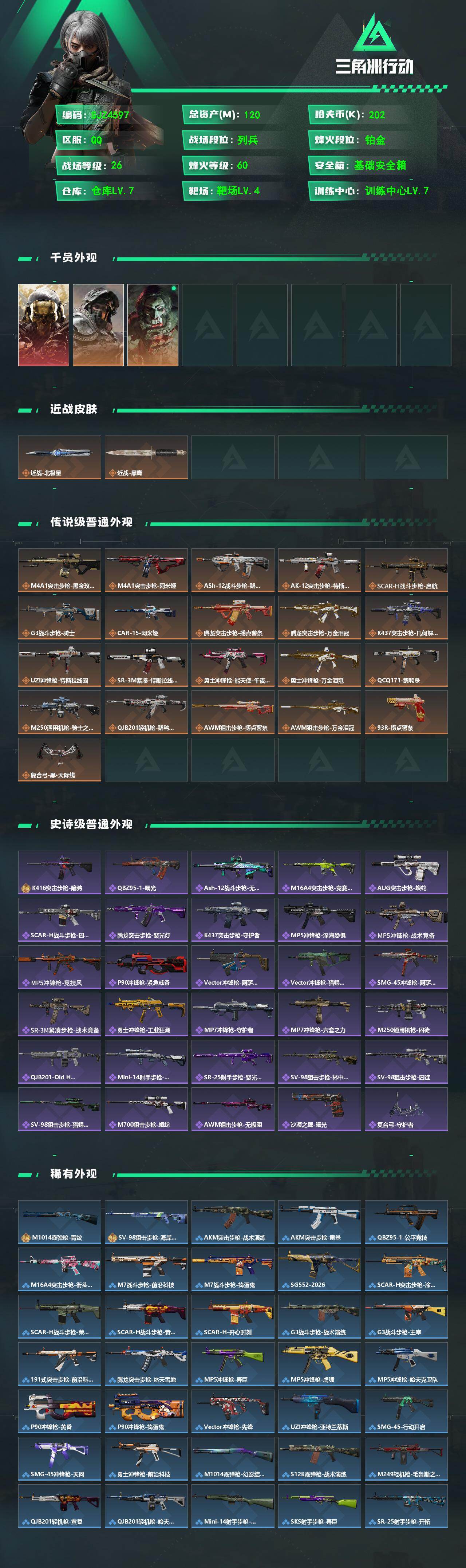 【SJZ4597】总资产(M):120M/哈夫币(K):202K/哈夫币(K):202K/传说枪皮数:21/全面战场等级:26_段位:列兵/烽火地带等级:60_段位:铂金/红狼-蚀金玫瑰/深蓝-不破誓约/红狼-电锯惊魂/近战-北极星/近战-黑鹰/M4A1突击步枪-蚀金玫瑰/M4A1突击步枪-阿米娅/ASh-12战斗步枪-鹅鸭杀/AK-12突击步枪-特斯拉线圈/SCAR-H战斗步枪-启航/G3战斗步枪-骑士/CAR-15突击步枪-阿米娅/腾龙突击步枪-捞点薯条/腾龙突击步枪-万金泪冠/K437突击