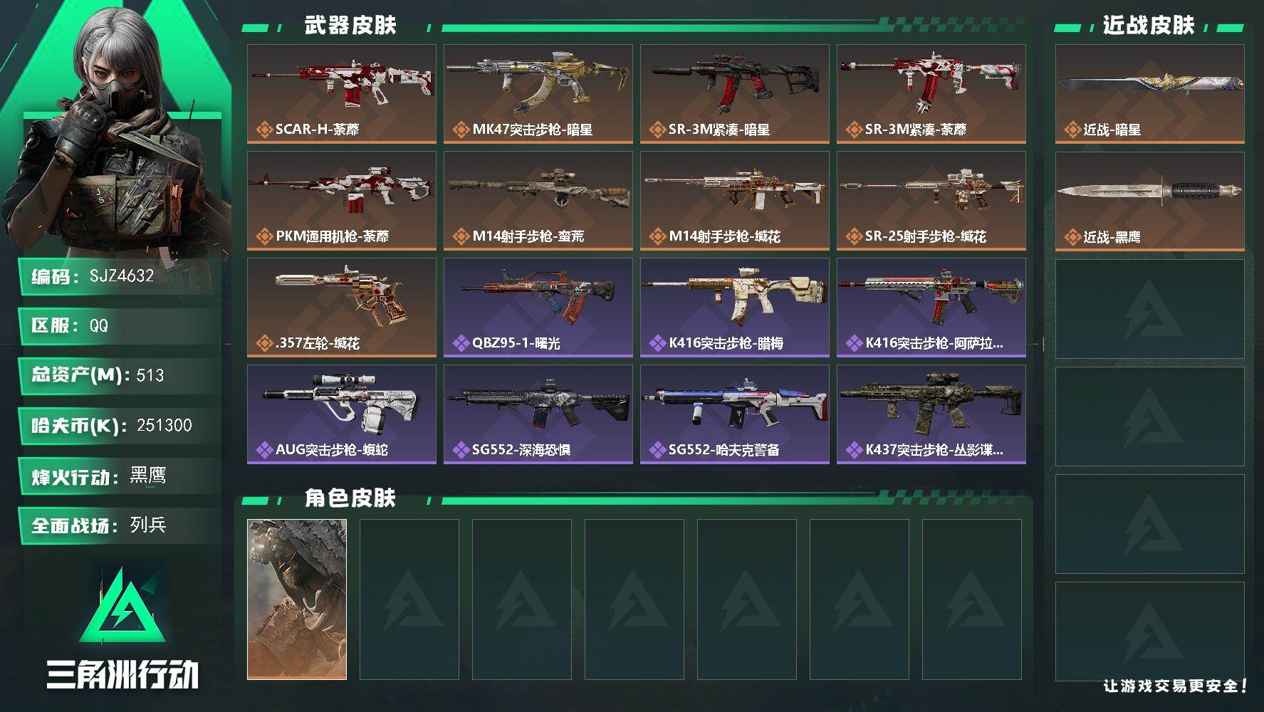 513m总资产-251300k哈夫币-60烽火等级-黑鹰-7战场等级-列兵