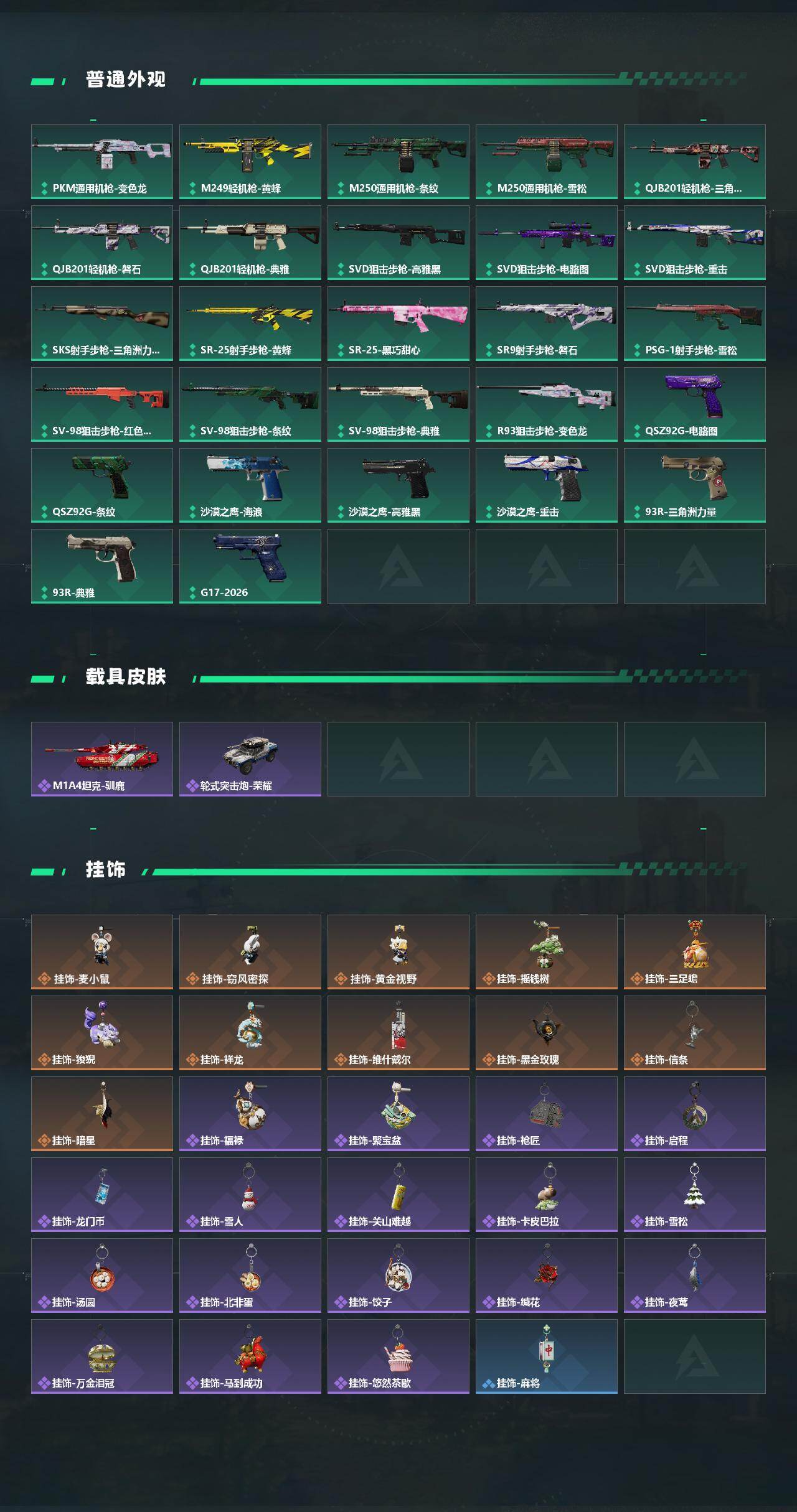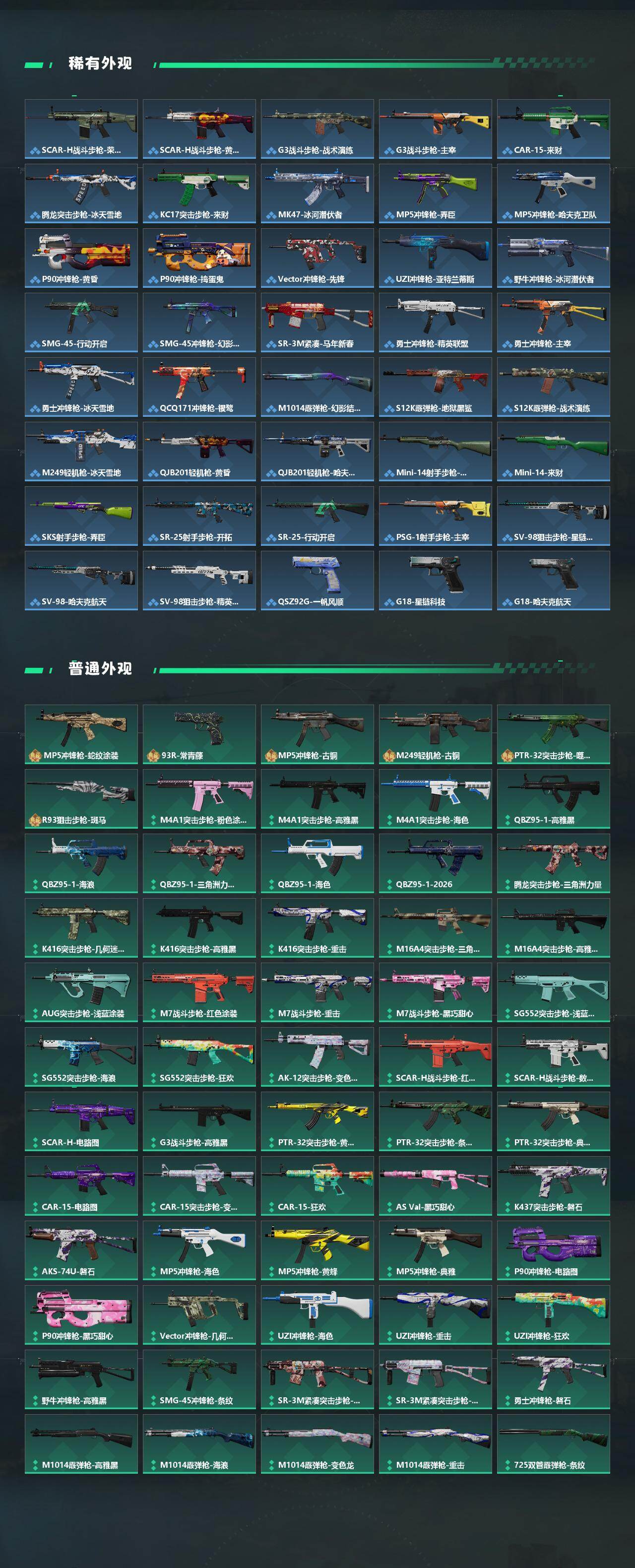 【传说外观】:M4A1突击步枪-蚀金玫瑰,M4A1突击步枪-阿米娅,AUG突击步枪-悠然茶歇,M7战斗步枪-零度协议,SG552突击步枪-运动员,SCAR-H战斗步枪-启航,G3战斗步枪-骑士,CAR-15突击步枪-阿米娅,腾龙突击步枪