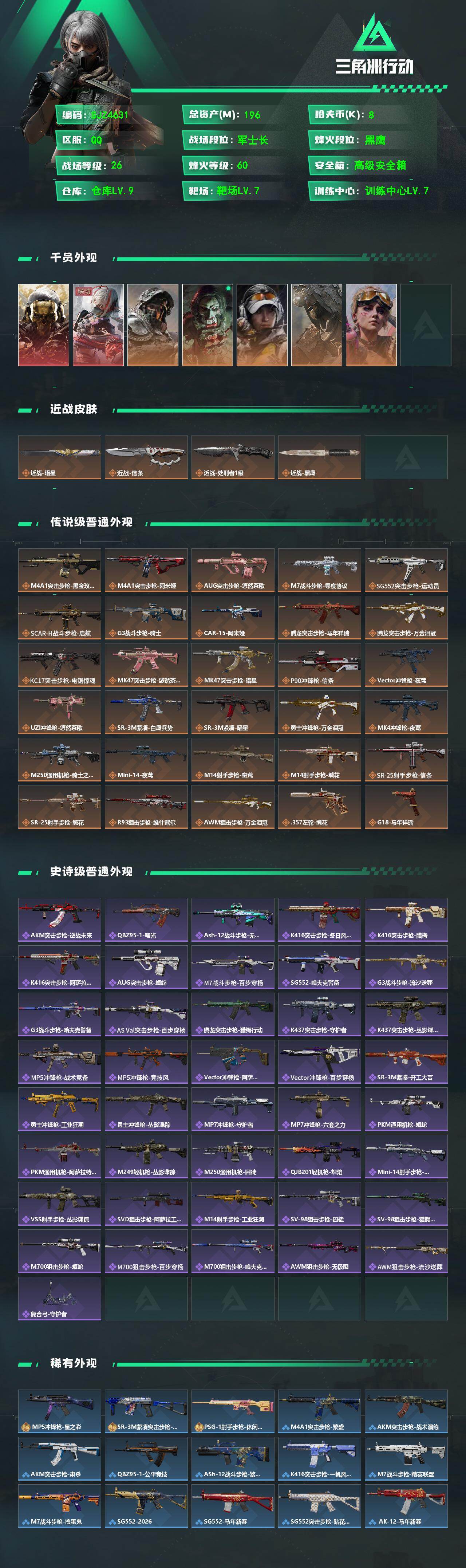 196m总资产-8k哈夫币-60烽火等级-黑鹰-26战场等级-军士长【干员外