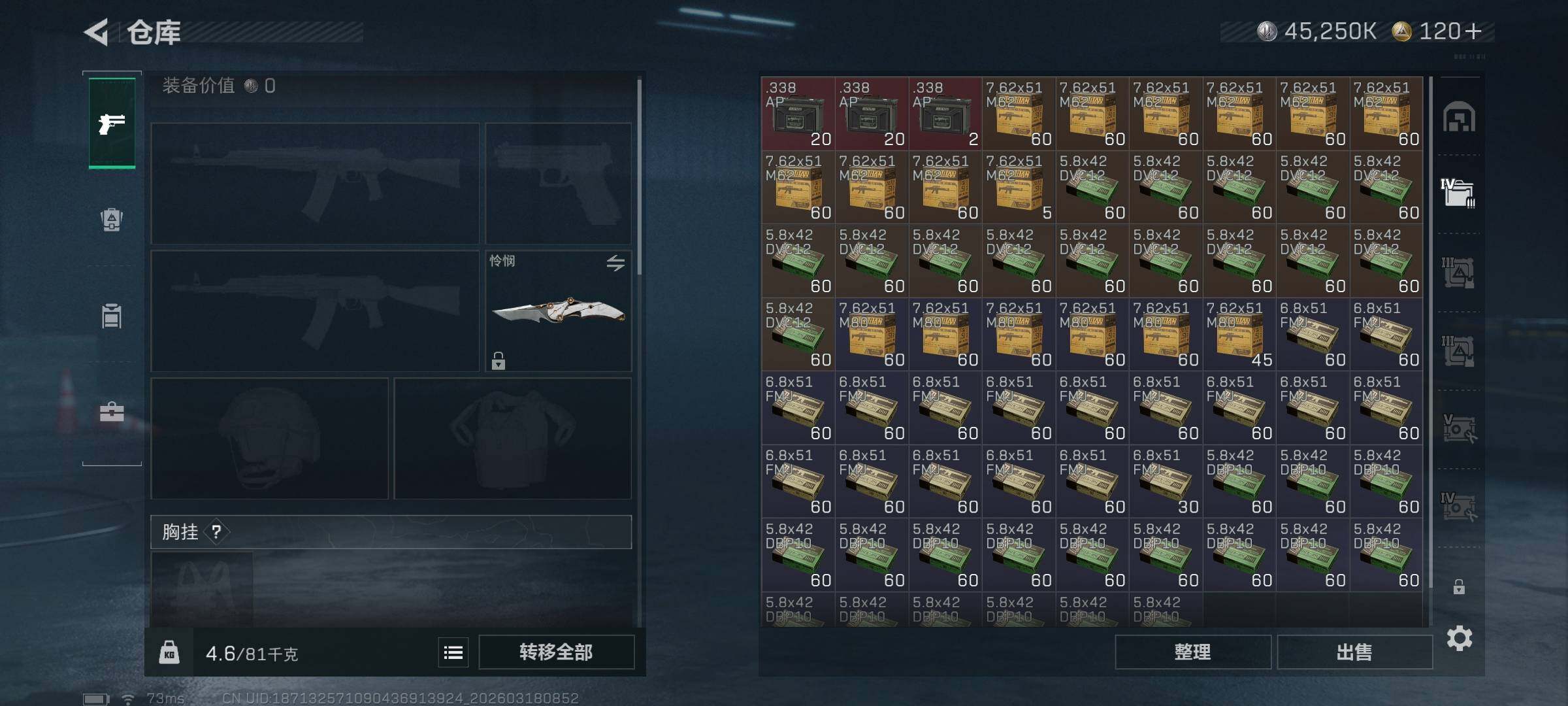 {特价出售}等级:60总资产:117.5M 纯币45250k 红皮:铁面判官 壮志凌云 刀皮 怜悯 砖皮: 优品b m7 优品a scar 优品b 火腾龙 优品b m250 特勤处:仓库6,训练6,靶场5