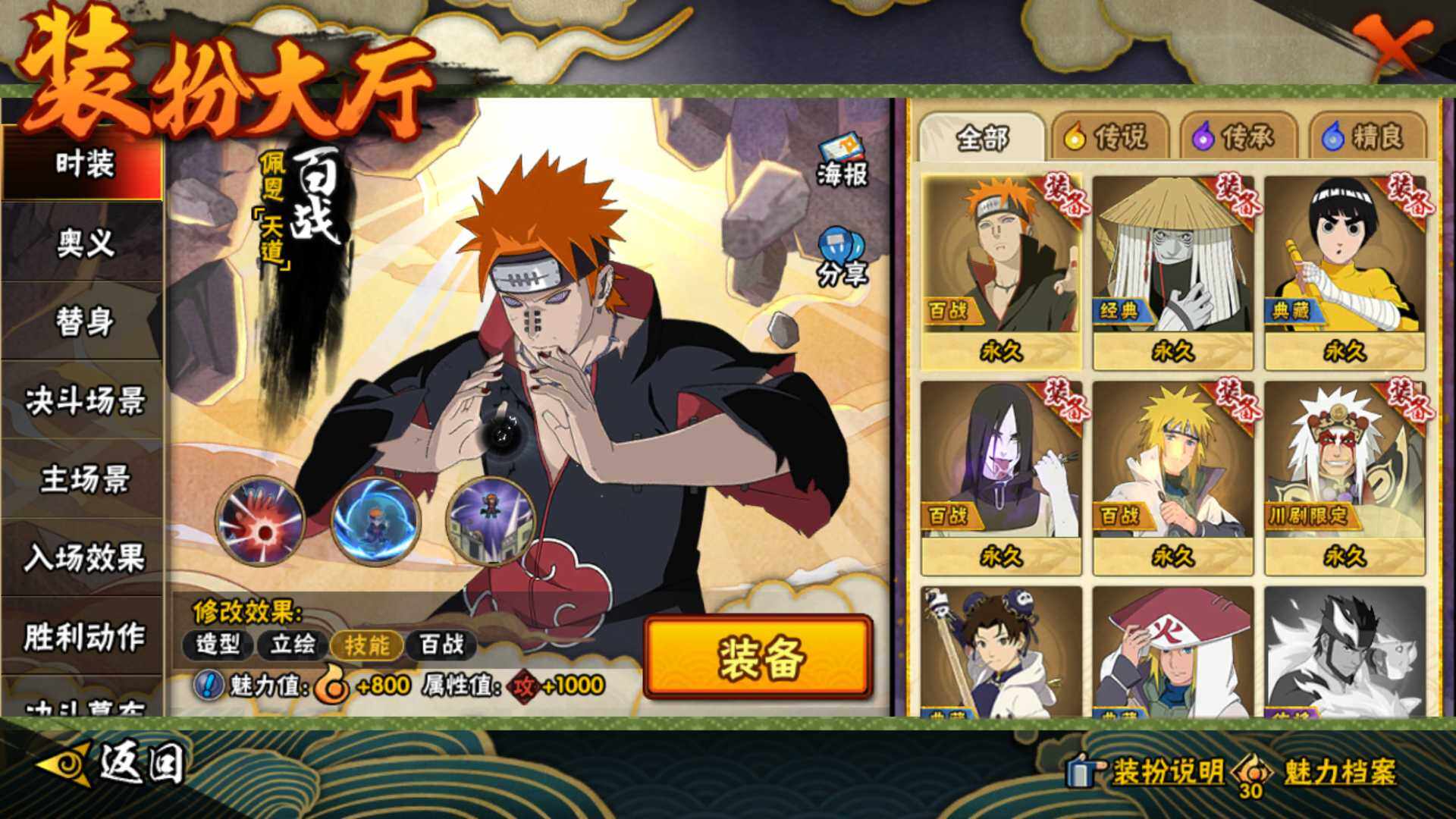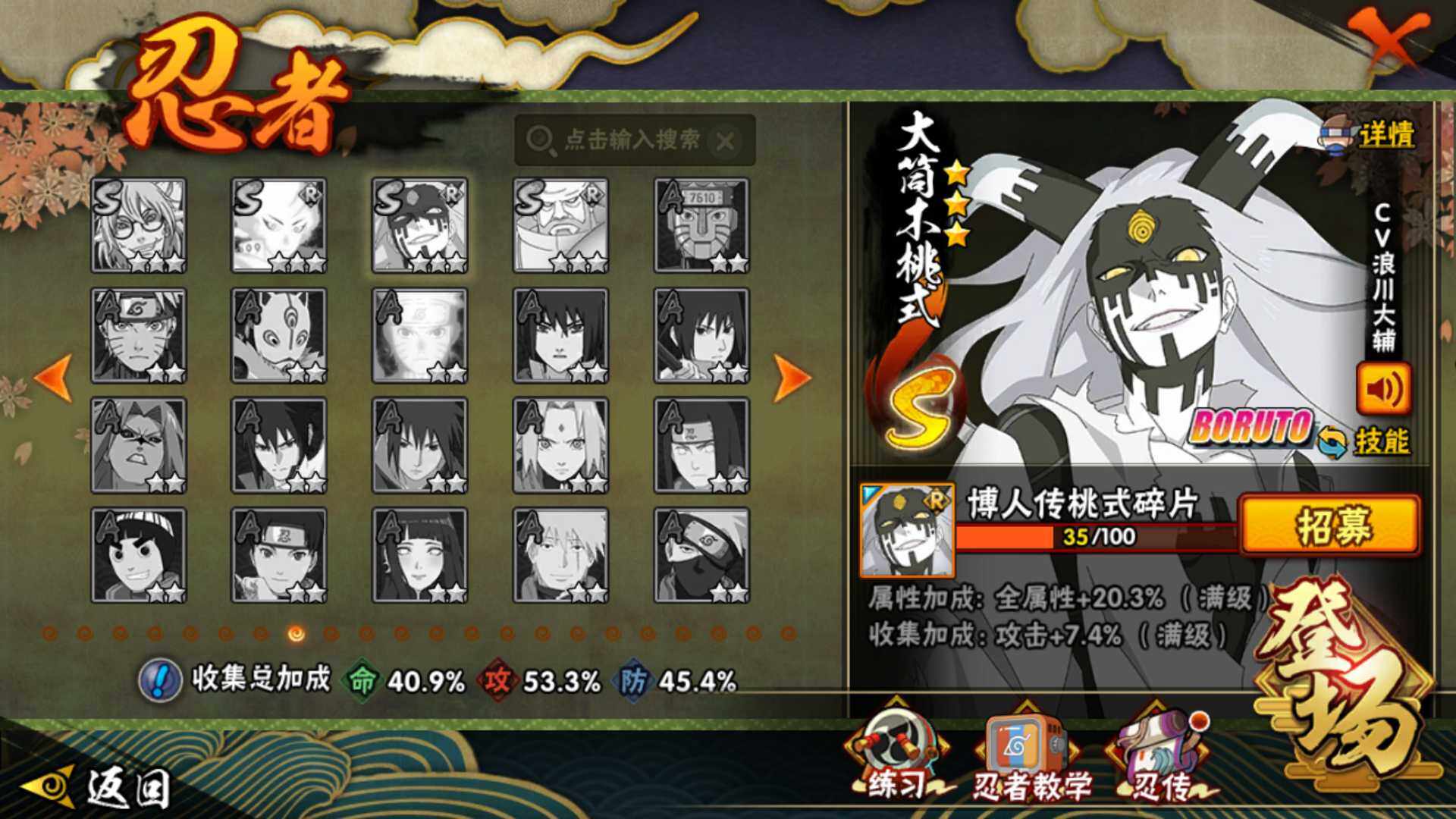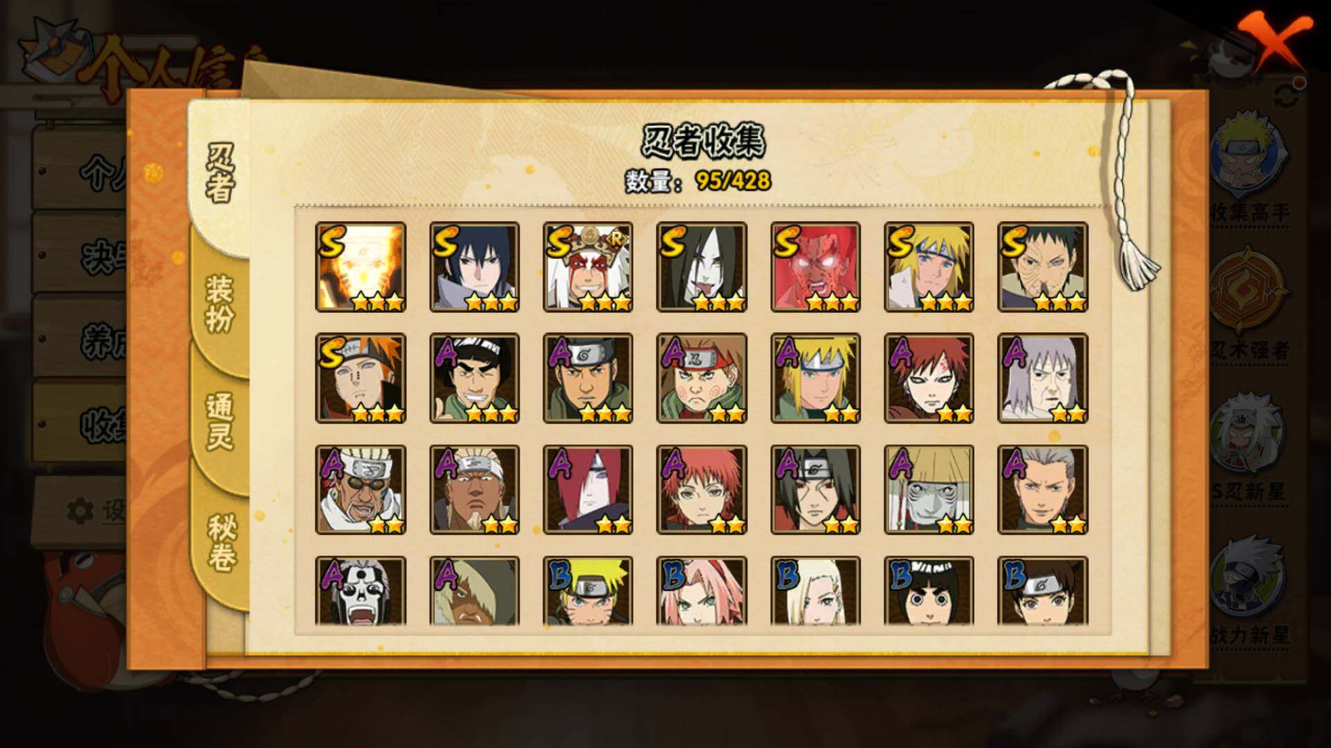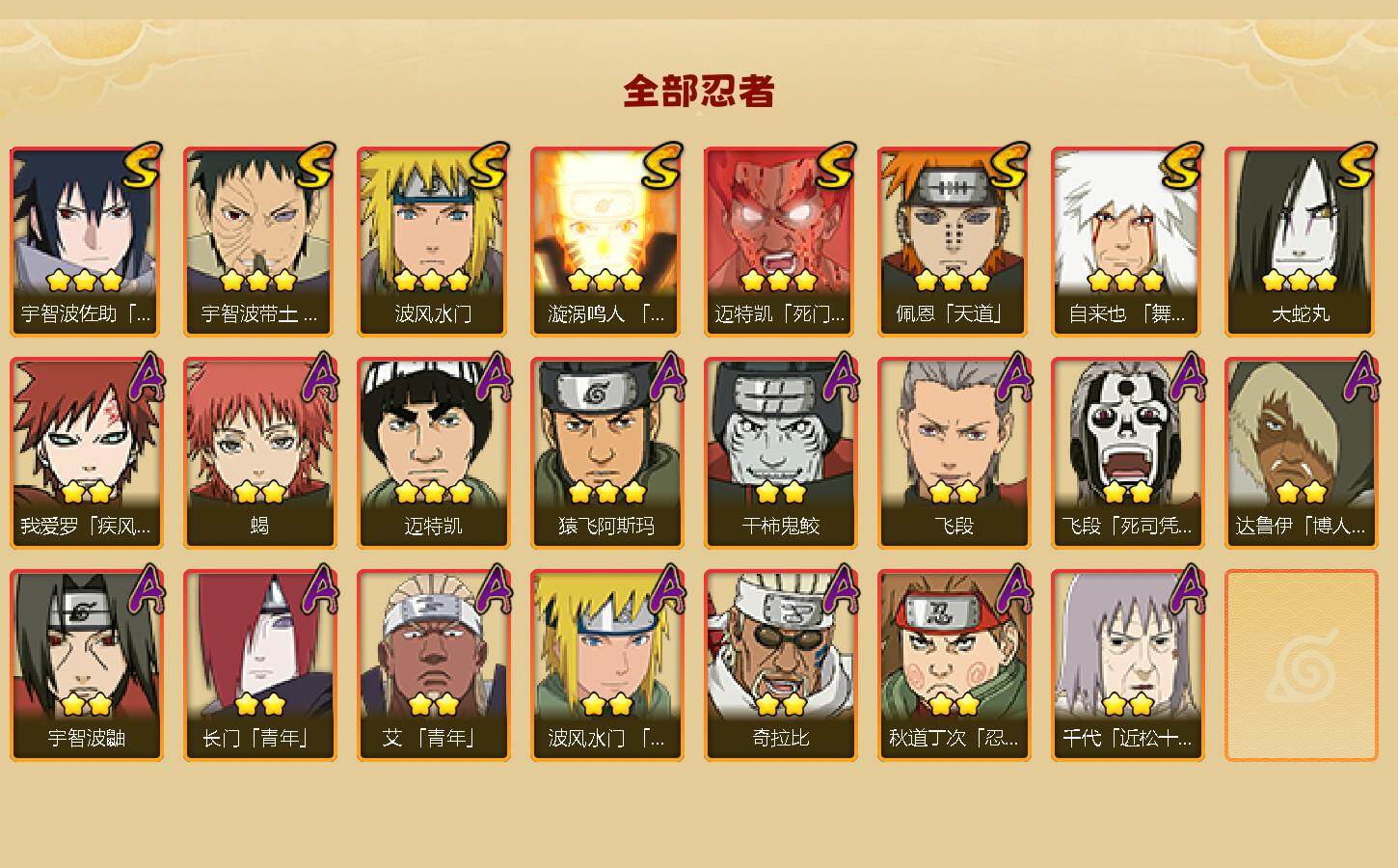 【S级忍者】:宇智波带土「忍界大战」(3星),自来也「舞之豪杰」(3星),大蛇丸(3星),波风水门(3星),漩涡鸣人「九喇嘛连结」(3星),迈特凯「死门」(3星),佩恩「天道」(3星),宇智波佐助「永恒万花筒」(3星)