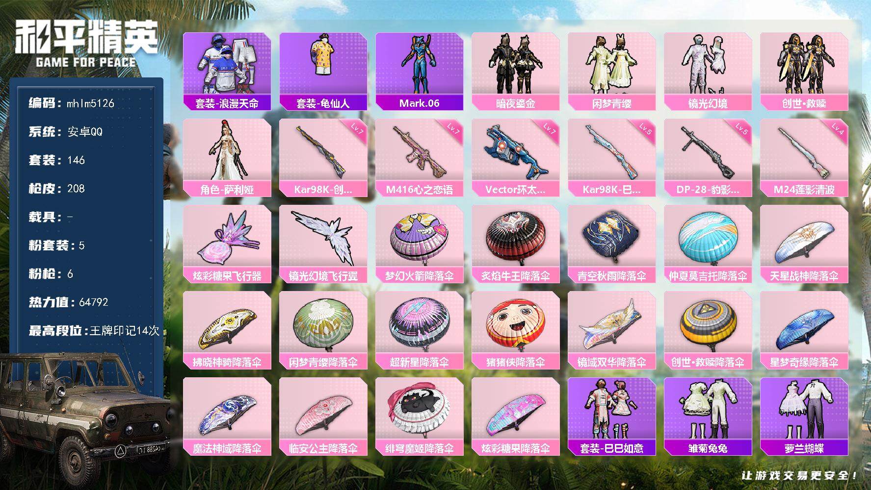 安卓 手Q-5粉装-6特效枪-0载具-2粉色飞行器-64792热力值-14王牌印记-146套装-208枪皮