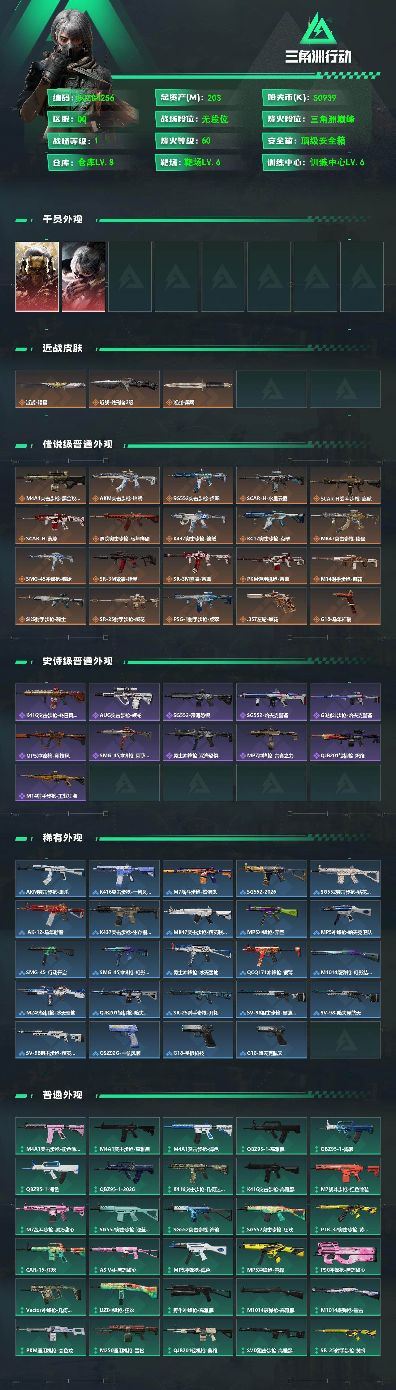 【SJZG4256】总资产(M):203M/哈夫币(K):50939K/哈夫币(K):50939K/传说枪皮数:20/全面战场等级:1_段位:无段位/烽火地带等级:60_段位:三角洲巅峰/红狼-蚀金玫瑰/骇爪-水墨云图/近战-暗星/近战-处刑者2级/近战-黑鹰/锦绣捆绑包/荼蘼捆绑包/暗星捆绑包/缄花捆绑包/M4A1突击步枪-蚀金玫瑰/AKM突击步枪-锦绣/SG552突击步枪-点翠/SCAR-H战斗步枪-水墨云图/SCAR-H战斗步枪-启航/SCAR-H战斗步枪-荼蘼/腾龙突击步枪-马年祥瑞/K