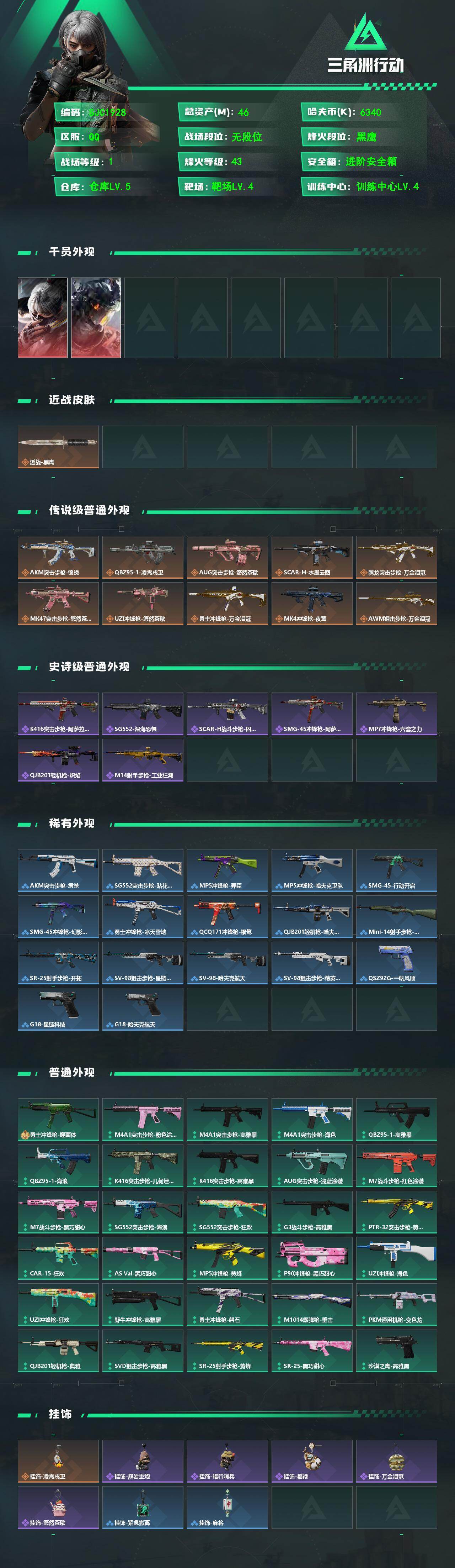 【SJC1928】总资产(M):46M/哈夫币(K):6340K/哈夫币(K):6340K/传说枪皮数:10/全面战场等级:1_段位:无段位/烽火地带等级:43_段位:黑鹰/骇爪-水墨云图/威龙-凌霄戍卫/近战-黑鹰/AKM突击步枪-锦绣/QBZ95-1突击步枪-凌霄戍卫/AUG突击步枪-悠然茶歇/SCAR-H战斗步枪-水墨云图/腾龙突击步枪-万金泪冠/MK47突击步枪-悠然茶歇/UZI冲锋枪-悠然茶歇/勇士冲锋枪-万金泪冠/MK4冲锋枪-夜莺/AWM狙击步枪-万金泪冠/K416突击步枪-阿萨拉