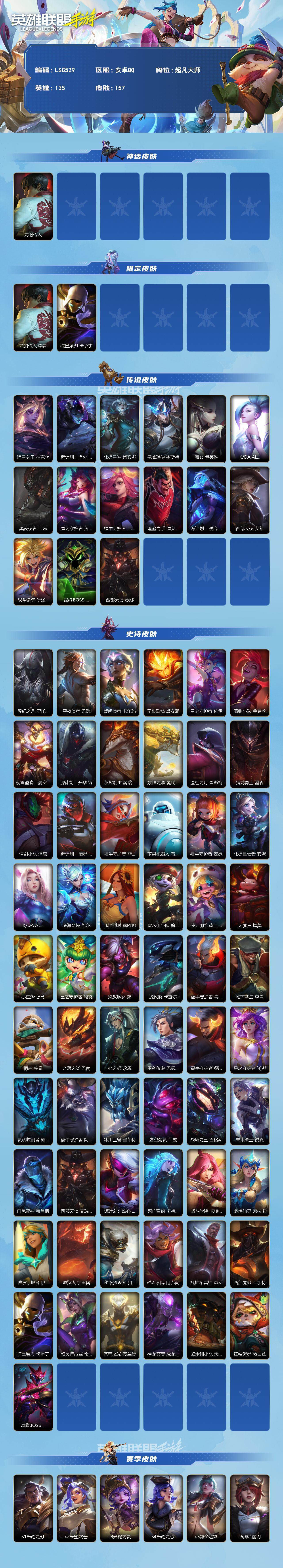 【LSC529】135英雄/157皮肤/超凡大师/龙的传人 李青/掠星魔刃 卡萨丁/暗星女王 拉克丝/源计划:净化 薇恩/北极星神 黛安娜/星域游侠 崔斯特/魔女 伊芙琳/K/DA ALL OUT 萨勒芬妮/黑夜使者 亚索/星之守护者 落 霞/福牛守护者 厄运小姐/灌篮高手 德莱厄斯/源计划:联合 艾希/西部天使 艾希/战斗学院 伊泽瑞尔/最终BOSS 维迦/西部天使 赛娜/腥红之月 亚托克斯/黑夜使者 凯隐/黎明使者 卡尔玛/无限烈焰 黛安娜/星之守护者 佐伊/清剿小队 金克丝/蕊雪盈春:晏安