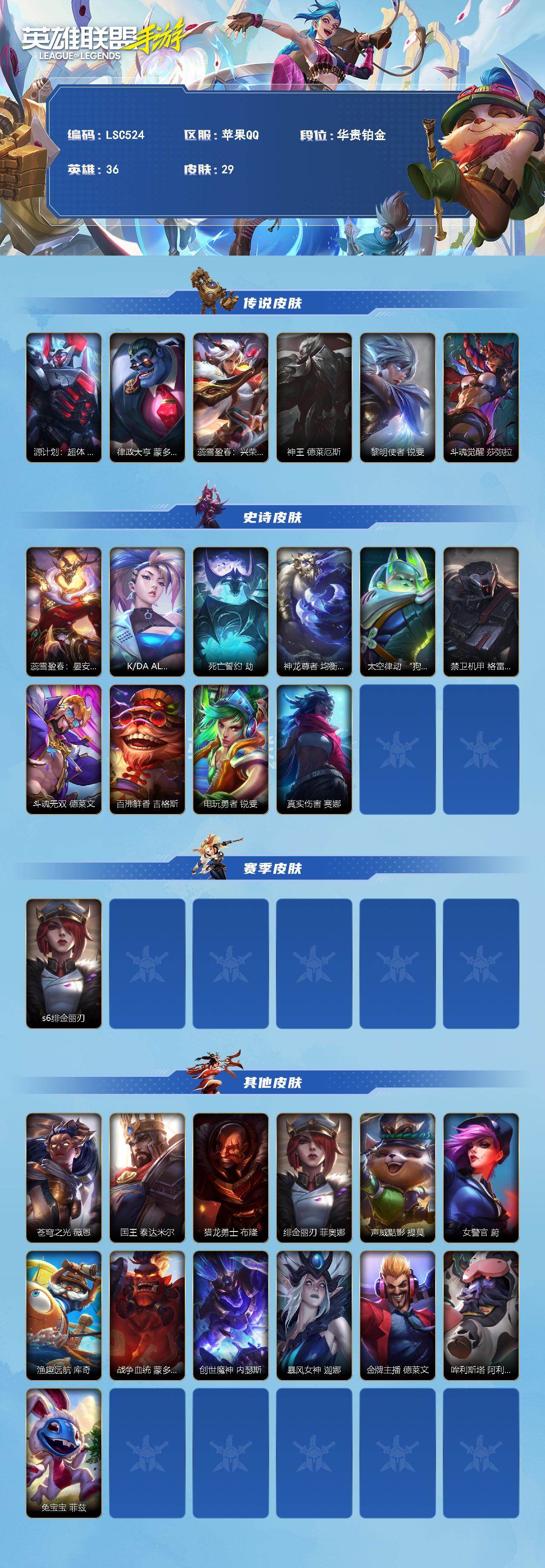 【LSC524】36英雄/29皮肤/华贵铂金/源计划:超体 莫德凯撒/律政大亨 蒙多医生/蕊雪盈春:兴荣 永恩/神王 德莱厄斯/黎明使者 锐雯/斗魂觉醒 莎弥拉/蕊雪盈春:晏安 赫卡里姆/K/DA ALL OUT 阿卡丽/死亡誓约 劫/神龙尊者 均衡之龙 沃利贝尔/太空律动 “狗头” 内瑟斯/禁卫机甲 格雷福斯/斗魂无双 德莱文/百沸鲜香 吉格斯/电玩勇者 锐雯/真实伤害 赛娜/s6绯金丽刃/苍穹之光 薇恩/国王 泰达米尔/猎龙勇士 布隆/绯金丽刃 菲奥娜/声威黠影 提莫/女警官 蔚/渔趣远航