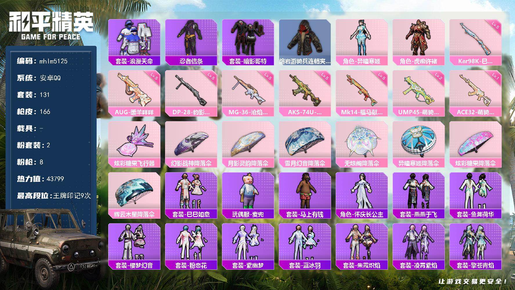 安卓 手Q-2粉装-8特效枪-0载具-1粉色飞行器-43799热力值-9王牌印记-131套装-166枪皮