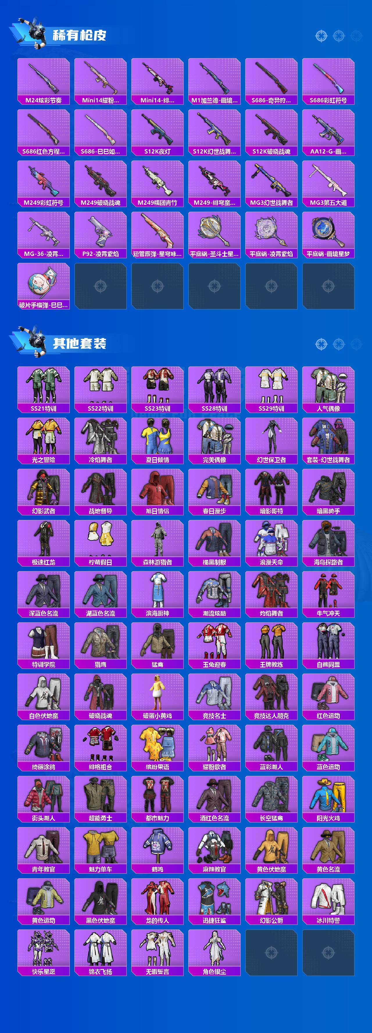 【粉色枪皮等级】:AUG-暖羊咩咩(五级),ACE32-萌骑漫游(一级),UMP45-萌骑冒险(二级),AKS-74U-森灵之息(五级),Kar98K-巳巳如意(五级),Mk14-福马献瑞(五级),DP-28-豹影疾电(五级),MG-36-沧焰双生(五级)