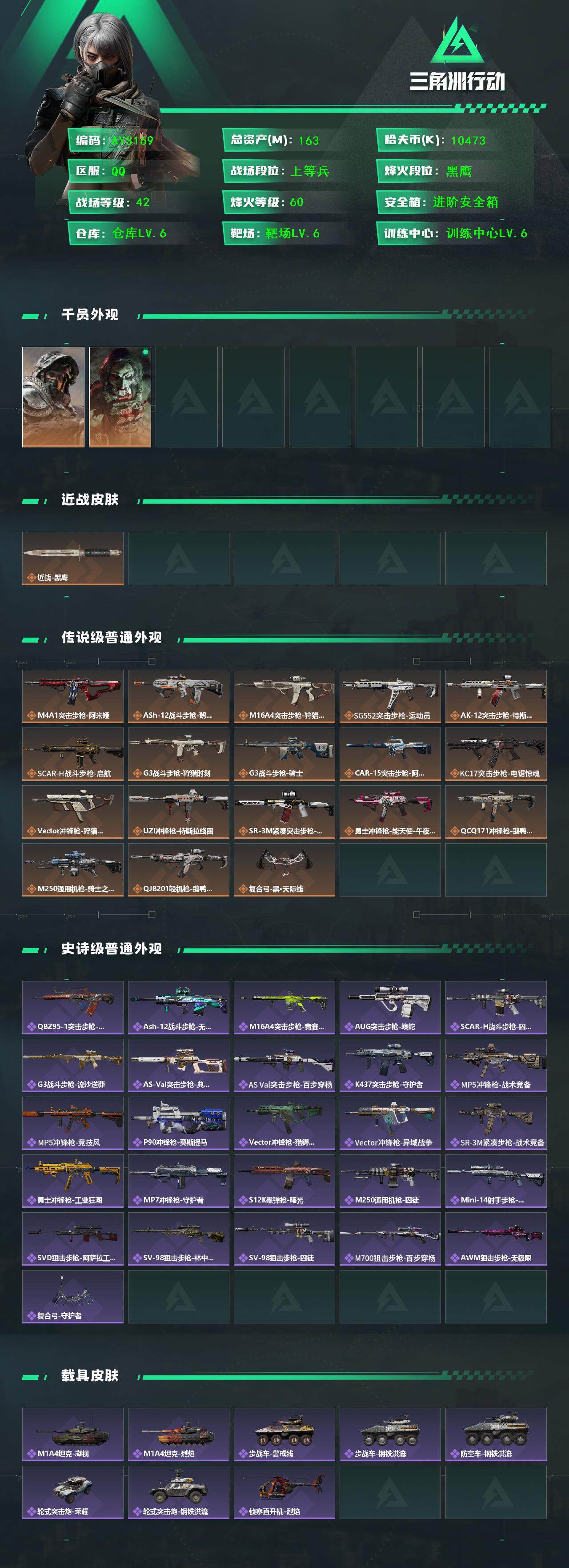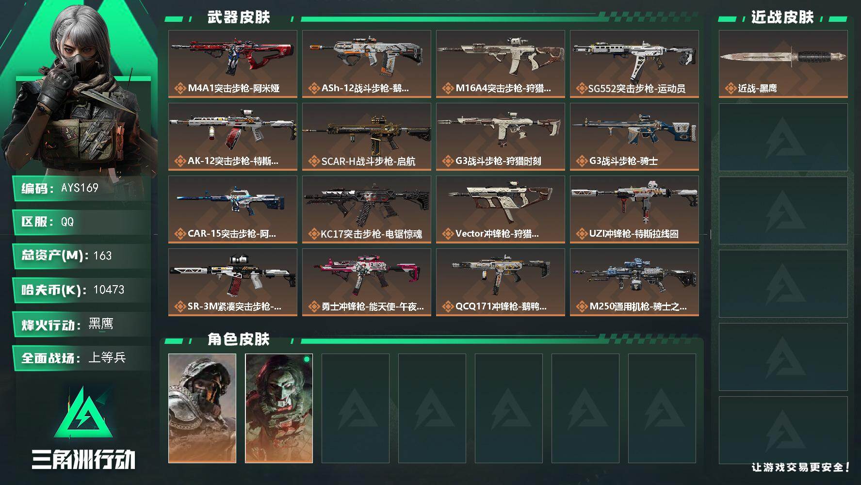 【店主推荐捡漏号!可直接换绑】10473k哈伏币-149m流动资产-60烽火等级-黑鹰-42战场等级-上等兵【干员外观】:深蓝-不破誓约,红狼-电锯惊魂【近战皮肤】:近战-黑鹰【传说外观】:M4A1突击步枪-阿米娅,ASh-12战斗步枪-鹅鸭杀,M16A4突击步枪-狩猎时刻,SG552突击步枪-运动员,AK-12突击步枪-特斯拉线圈,SCAR-H战斗步枪-启航,G3战斗步枪-狩猎时刻,G3战斗步枪-骑士,CAR-15突击步枪-阿米娅,KC17突击步枪-电锯惊魂,Vector冲锋枪-狩猎时刻,UZ