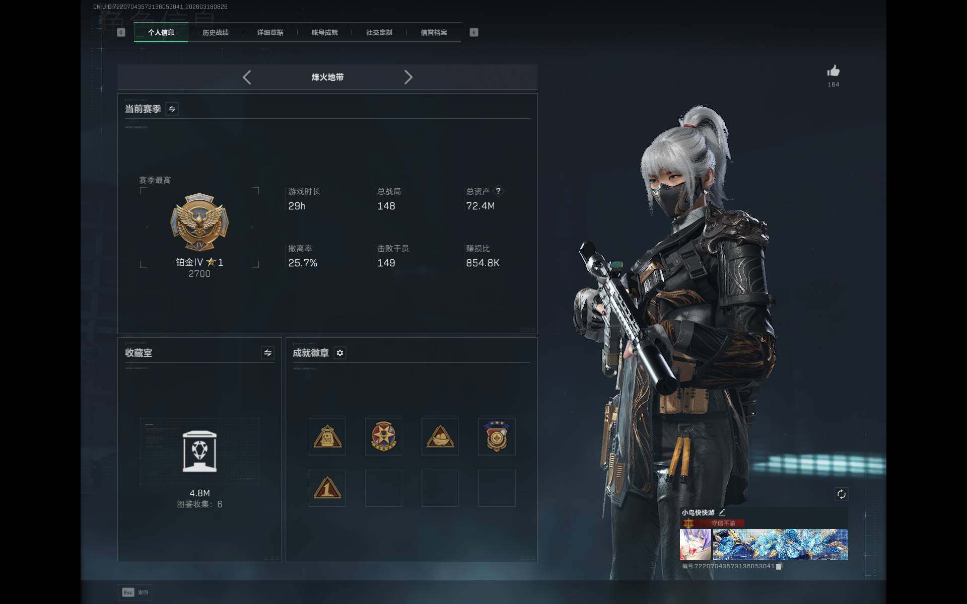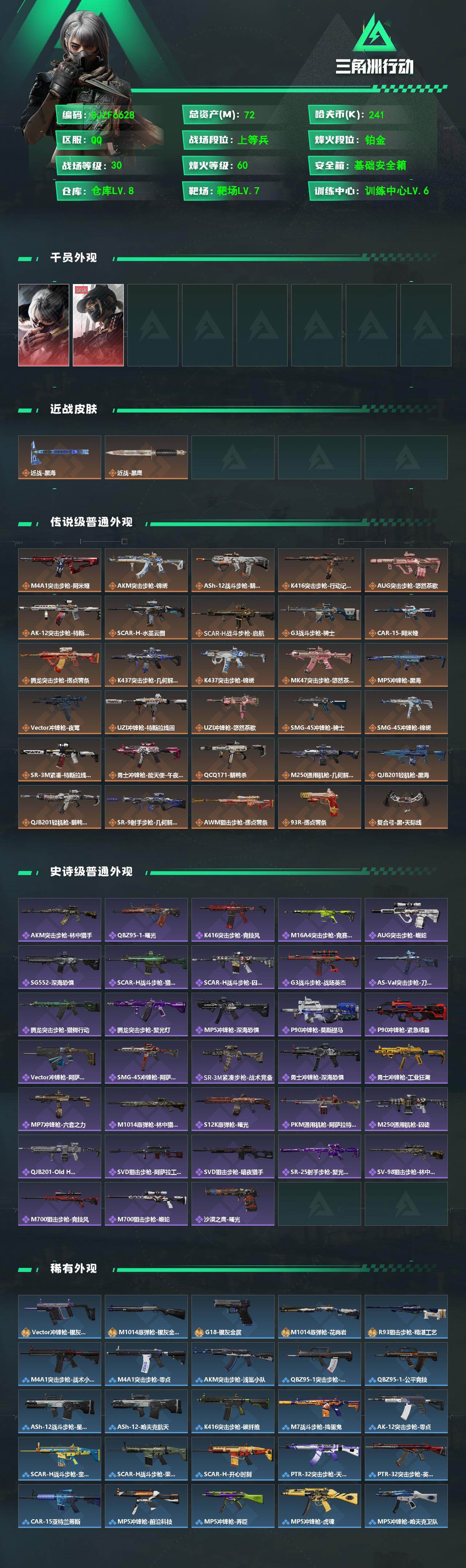 【SJZF6628】总资产(M):72M/哈夫币(K):241K/哈夫币(K):241K/传说枪皮数:30/全面战场等级:30_段位:上等兵/烽火地带等级:60_段位:铂金/骇爪-水墨云图/露娜-黑·天际线/近战-黑海/近战-黑鹰/M4A1突击步枪-阿米娅/AKM突击步枪-锦绣/ASh-12战斗步枪-鹅鸭杀/K416突击步枪-行动记录/AUG突击步枪-悠然茶歇/AK-12突击步枪-特斯拉线圈/SCAR-H战斗步枪-水墨云图/SCAR-H战斗步枪-启航/G3战斗步枪-骑士/CAR-15突击步枪-阿