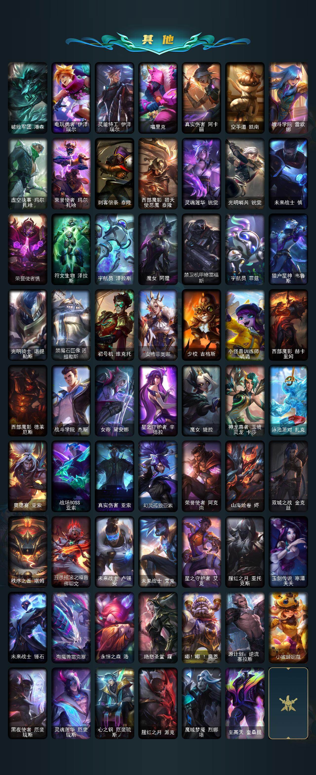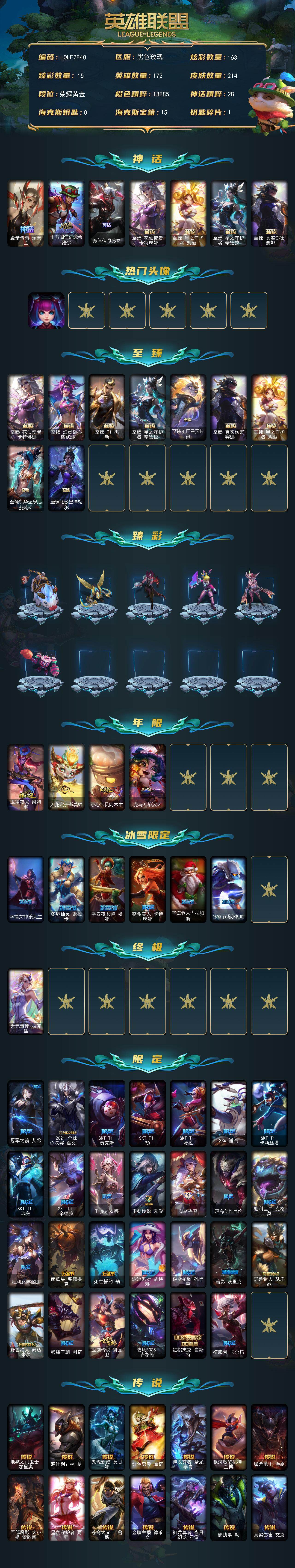 【LOLF2840】172英雄/214皮肤/1终极/12神话/38限定/15臻彩/163炫彩/16传说/27史诗/黄金/殿堂传奇乐芙兰/十五周年纪念希维尔/殿堂传奇薇恩/至臻真实伤害赛娜/至臻花仙使者卡特琳娜/至臻星之守护者妮蔻/至臻星之守护者辛德拉/银河魔装机神安妮头像/至臻幻灵狮心蕾欧娜/至臻T1杰斯/至臻永恒星灵佐伊/至臻莲华温泉厄斐琉斯/至臻北极星神梅尔/无畏骑士瑟庄妮赤子初心/冠军掠夺者卡兹克凯旋圣装/西部魔影卢锡安贝利尔之怠/幻灵战斗兔锐雯梦幻强袭/破败军团厄运小姐灵岛征伐使/可爱可