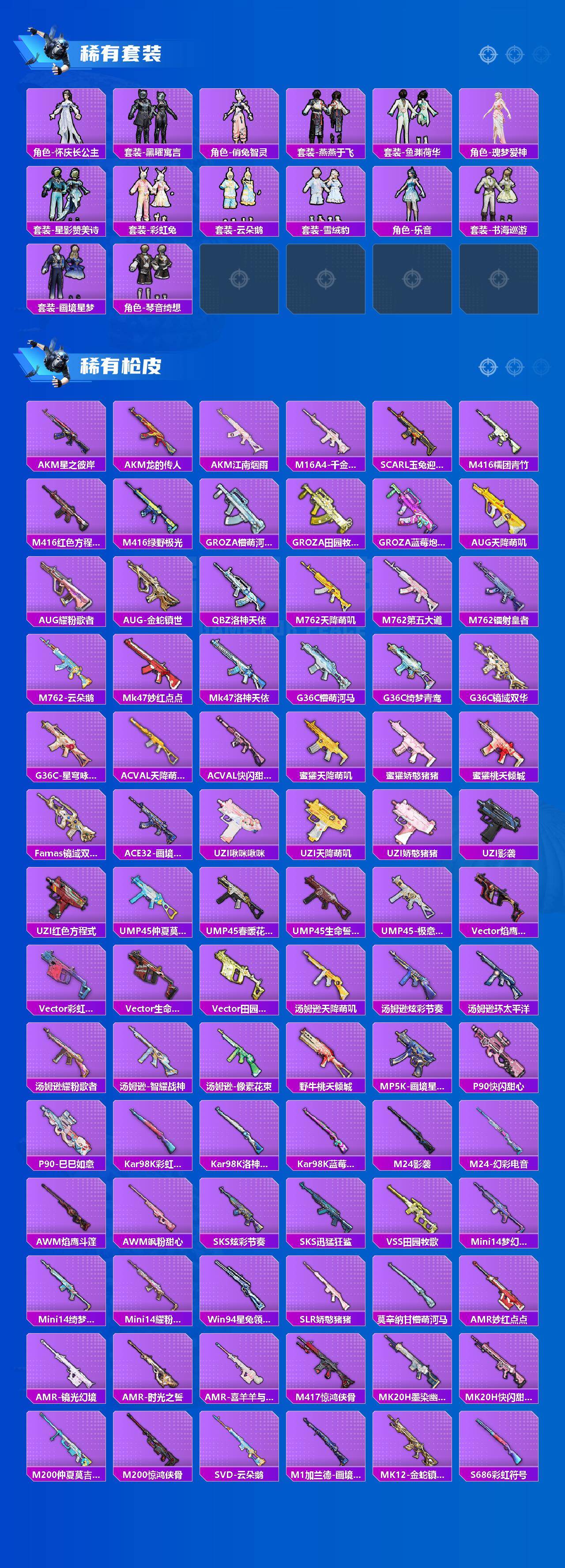 【粉色枪皮等级】:AKM-星际浪客(五级),SCAR-L-锦绣绵绵(五级),M416-五爪金龙(五级),