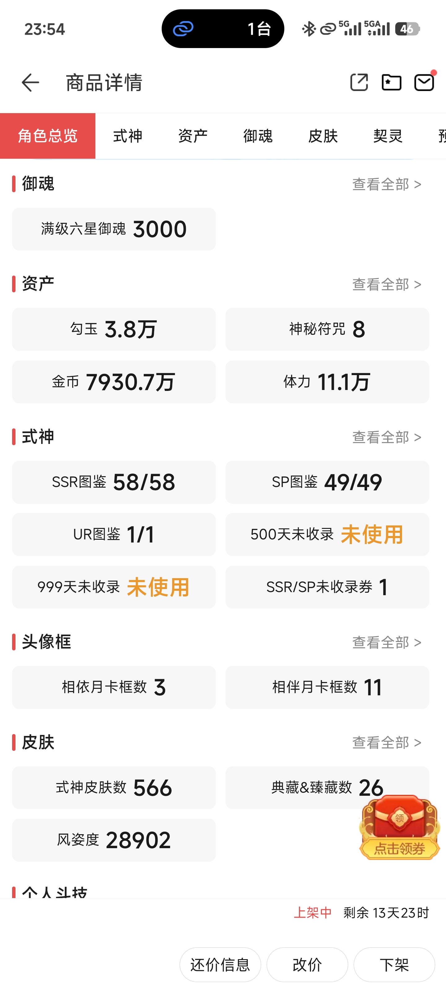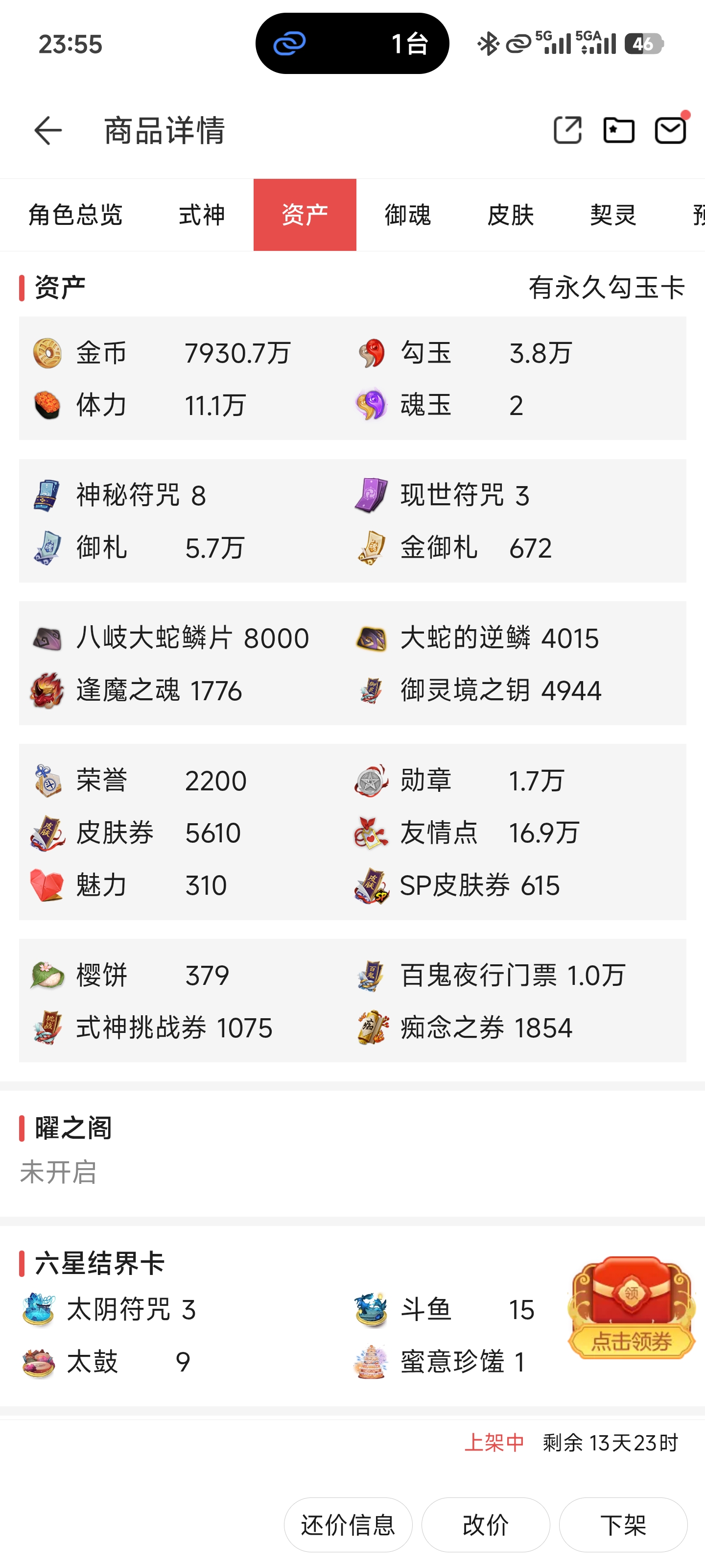 全图鉴成品号,签到2973天,SSR/SP/UR全图鉴,204六星,三张未收录符咒,联动23个